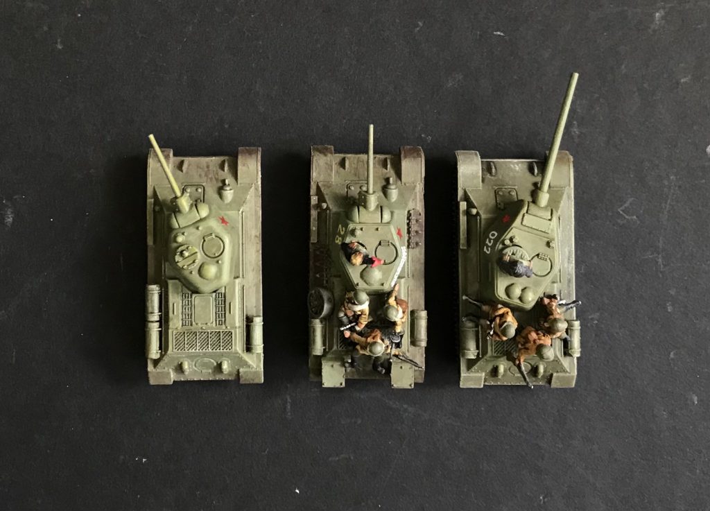 You get six T-34s in a pack, enough to fulfill all your tiny tank needs for most games systems (and then some) if you're playing at reduced scale 28mm-designed games. This is not only a good amount of tanks, but if you're historically-minded (and why wouldn't you be? you're here!) it's two "proper" Soviet tank platoons comprising of a command tank and two others. Commanders peeking out of their hatches support making a clear command tank where that's a necessary or desirable modelling choice. The six hulls in the pack also let you experiment with different stowage positions and I've built each of mine to be at least slightly different from one another.