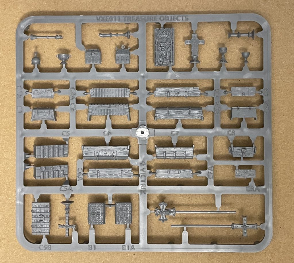 Victrix Treasures and Chests, credit: LenoonThis will do very well for anyone interested in glamming up their board with scatter and scenic terrain and most of a sprue has gone into my Sarissa Norman Church to give it a lot of period-accurate life! Above and beyond the scenery, it’s a set that will immediately appeal to Pillage players, with the vast majority of items being large enough to use as loot markers without further basing. You can very quickly and easily represent portable loot with a casket or chest, potentially even assigning different gold values to different items. Pillage is all about the look and feel, so having your models raid a monastery and come away with golden crosses and jewelled bibles rather than cardboard tokens is absolutely well worth the time and money you’ll invest in this set.