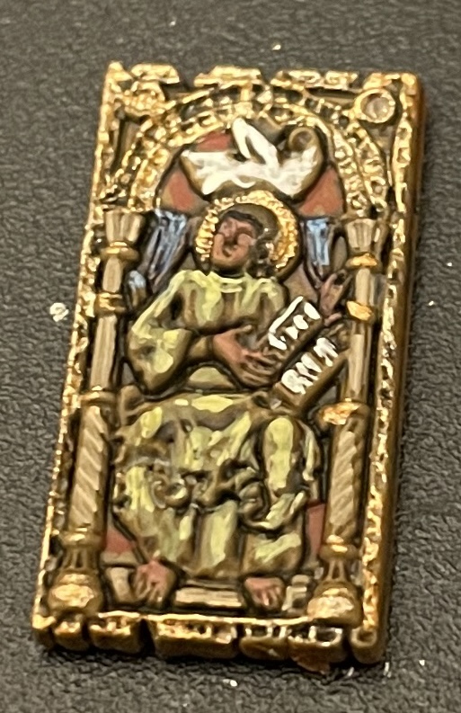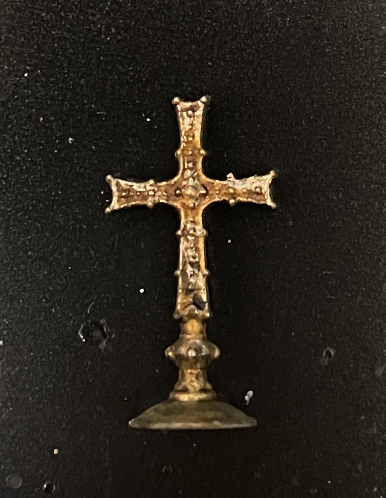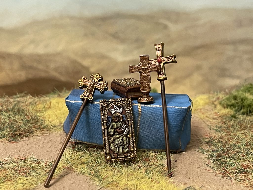 The treasures in the kit are widely inspired and that's all to the good. The 7th-11th centuries were a period of highly skilled crafts, devotional metalwork and incredibly decorated bibles, all of which were part of a rotating cast of stuff people stole from, traded with, or gifted to each other. Items from Ireland are found in Norway, Carolingian artworks end up in Scotland, Saxon gold working makes it to Byzantium and - not included in this set presumably because they would be sub 1mm in size - Arabic dirhams get everywhere. The treasures included then are nicely eclectic, and all very closely inspired by archaeological examples.One of the altar crosses is very clearly the Cross of Cong - probably the best bit of Irish gold and silverworking from the 12th century. The plastic version is lovely, a beautiful representation of the real one.
