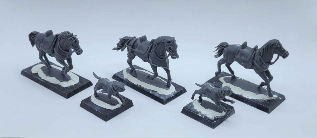 The horses easily fit on 25mm x 50mm bases and the dogs fit nicely on 25mm square bases. The integral bases are fairly thin, but we still recommend using a bit of modeling putty or other filler to hide the edge of the integral base. While you’ve got the putty out, the dogs’ tails have a small gap at the base that will look better filled in. Both animals have a small seam where the halves come together which can be filled with a gap filler, like Liquid Greenstuff.
