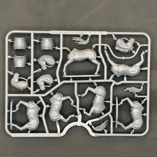 Photo by Wargames AtlanticThe horse sculpts are reused from other Wargames Atlantic kits with new saddles and armour to dress them up. They’re well sculpted, and all the new components are designed to fit over the old sculpts very precisely. These are easy to clean-up and assemble, though we’ve found that the straps that go over the horses’ rears are a bit fiddly to line up and glue, so make sure to dry-fit them before gluing them on.