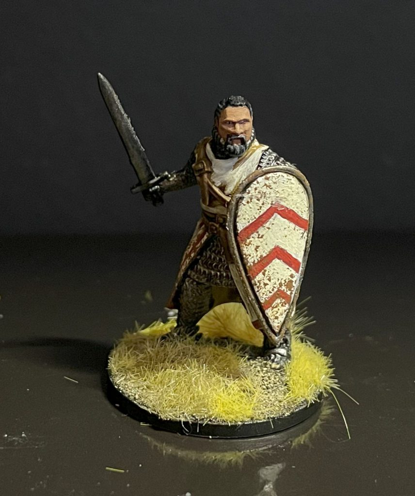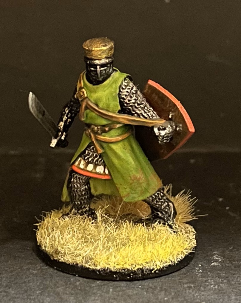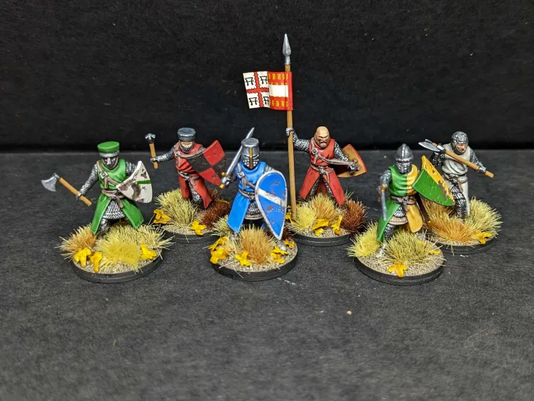 I found this kit a real delight to paint, and decided on simple, bold, block colour and dark mail. Detail is excellent - raised and prominent enough that quick painting with washes, one-coat speed paints and drybrushing will do an excellent job, but with large areas of cloth and textile if you wanted to try your hand at more complex blends and embroidery. I went with simple, to (for once) create a colourful force. I used our article on Colour in the Medieval as a base and picked strong tones that could be achieved with Woad, Madder, Weld and Iron, as well as undyed wool. The cloth paints well and has lots of texture with folds and deeper ruffles (idk what the right word is for when cloth just goes in and out - waves?), and given that I built everything for early knights, felt that single colour blocks were most appropriate (and fun to paint!).