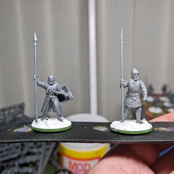 The knights are scaled to 28mm with relatively realistic proportions, eschewing the heroic scale look for slimmer arms, legs and weapons. They've clearly been scaled to the existing Footsore Miniatures metals range, and will work perfectly alongside them. Other plastic kits of knights from similar periods compare well, though the Wargames Atlantic knights are slightly smaller.