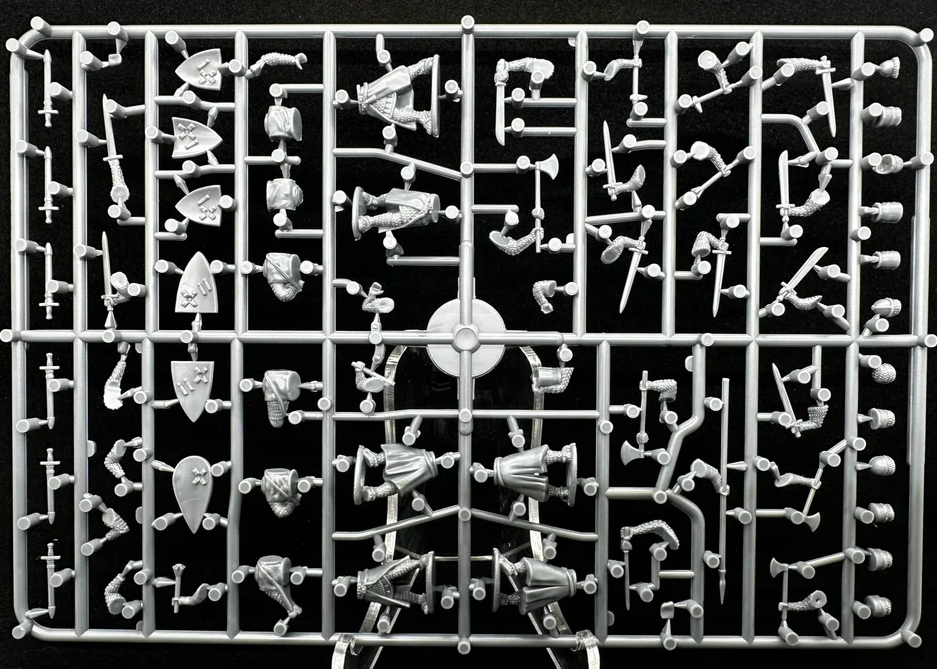 Foot Knight Sprue, Credit: Wargames Atlantic. The sprue you get in the box lacks the additional sprue spur things at the bottom of the image.You've got a lot of options here for mail armoured knights throughout the 12th and 13th centuries. That includes a huge range of weapons - 21 per six bodies, with options including the classic straight sword, falchions, hammers, axes, and BIG axes and swords.T There are six shields in kite, flat-topped kite and heater forms - not quite enough on each sprue to do all of a single type though. Head options span the period, from the Nasal Helm (Flat top, mail over the face) to the Great Helm (classic Knight Bucket helmet). While its a generic kit that covers nearly 200 years, all those options mean that if you want to tailor it to a specific time frame or war, you can. Which is pretty neat really, isn't it?