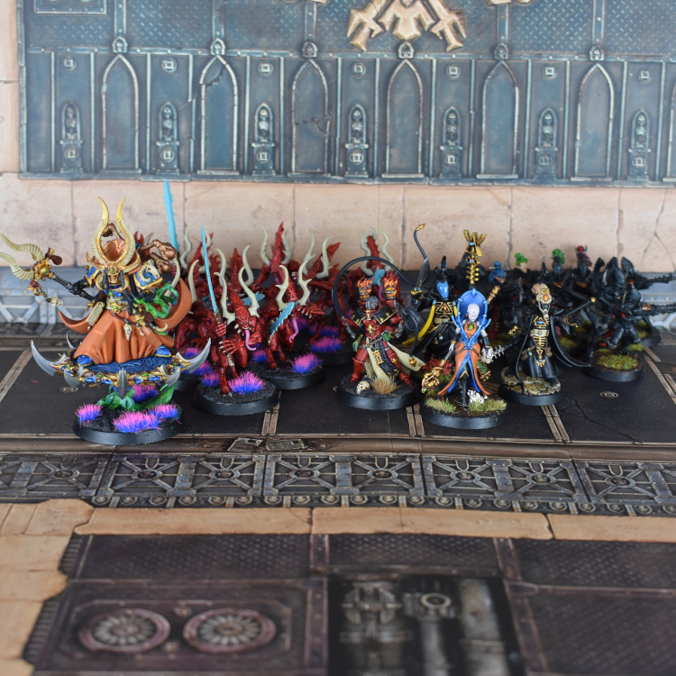 What happened instead is that I a) realised my Leadbelcher and Xereus Purple were both running critically low, which meant my plan to paint a Knight was out the window, and b) wanted to make the Backlog Number go down a bit quicker than I had been. I had the Eldar psykers sat on my shelf, and my Ulthwe scheme is quite light on the silver metals and relatively quick to do, so over the course of a couple of films I whizzed through them. Then, enter the Bloodletters. I painted these almost entirely with Contrast paints - the skin is a single layer of Blood Angels Red, the swords were Aethermatic Blue that I drybrushed with Baharroth Blue, and then it's just a bit of bone for the horns and pink on the tongues et voila, 10 Bloodletters painted. For those keeping score at home - no, I don't have a Chaos army (yet), I just had these lying around, and with no tournaments to paint for it was the opportune time to have some fun blasting through some models with Contrast. Finally for this month, and in a similar vein, I've had 9 Kabalites sat on my shelf for ages from where I needed another shredder and had no body to put it on - the obvious choice was to simply buy a whole box. My Kabalite scheme is very quick to paint, and so these 9 guys were finished as well. Much progress!