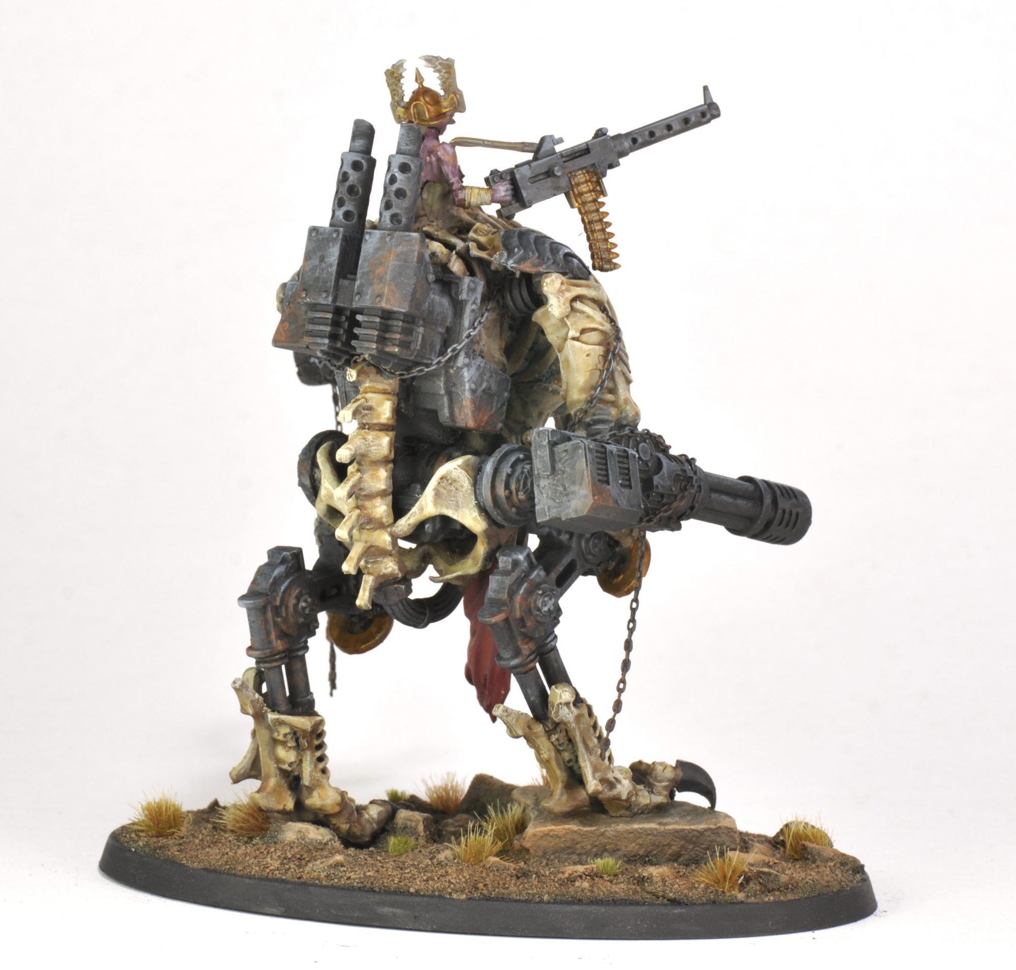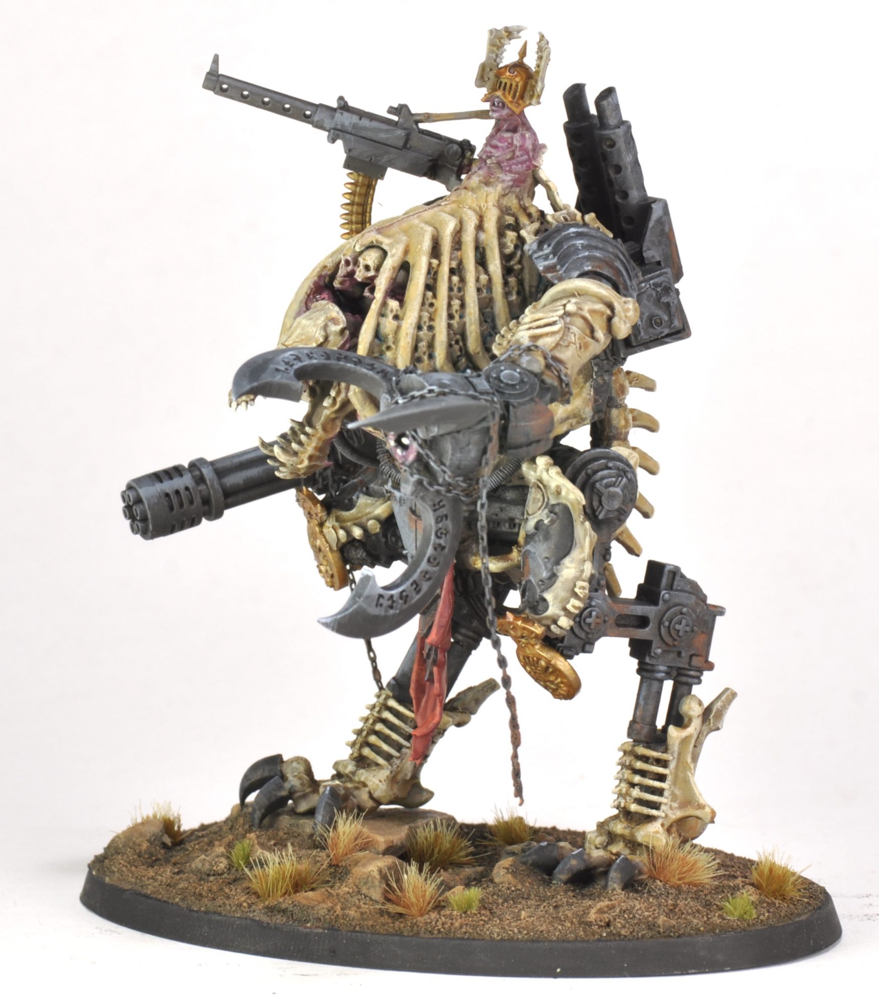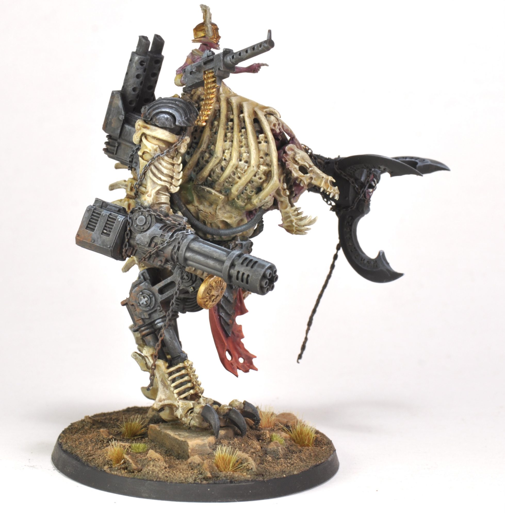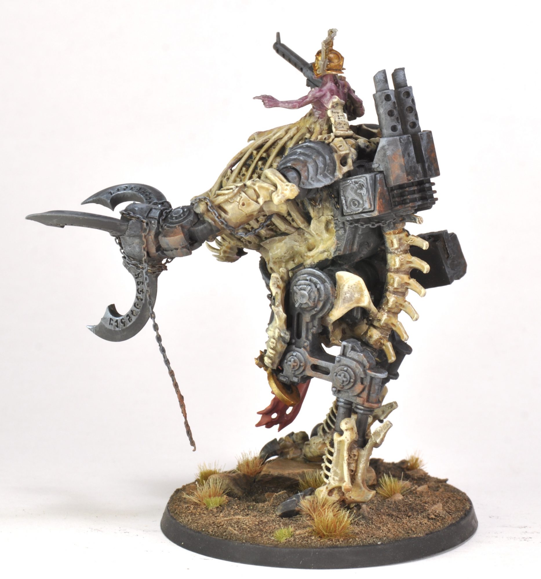 This month I threw together a kitbashed Daemonic War Dog Stalker for Smash Bash 2022. (Put on by @totally_not_panicking on Instagram.) The bulk of this build is a busted up Astra Militarum Sentinel and a busted up Dread Abyssal from Mortarchs of Nagash. Splash in some leftover bits from two Ossiarch Bonereaper Gothizzar Scavengers, a poorly recast Contemptor Dreadnought, a zombie torso, and some random chaos bits and there you have it.