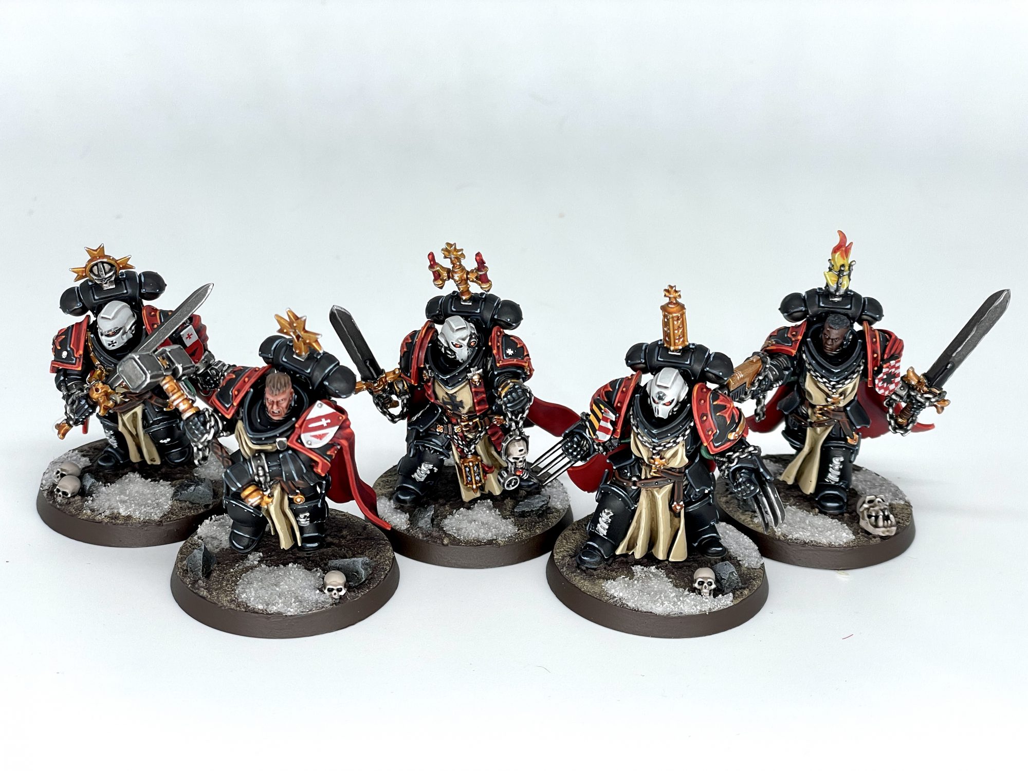 First up was this unit of Sword Brethren. I built the lightning claws and thunder hammer because they're cool, and just put power swords on the rest because I don't want to have to keep track of 5 different weapon profiles. What was really fun was coming up with individual heraldry for each of them, and using as many cool bits in the kit as I could reasonably fit.
