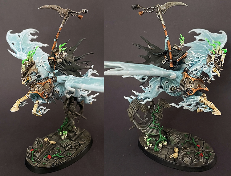 Looking for a break from red/beige, I decided on a whim to pick up the Reikenor the Grimhailer that I've had sitting, primed, on my desk for at least three years. Definitely an involved model, but I do love my ghost-horsies and it was nice to get back to Nighthaunt...