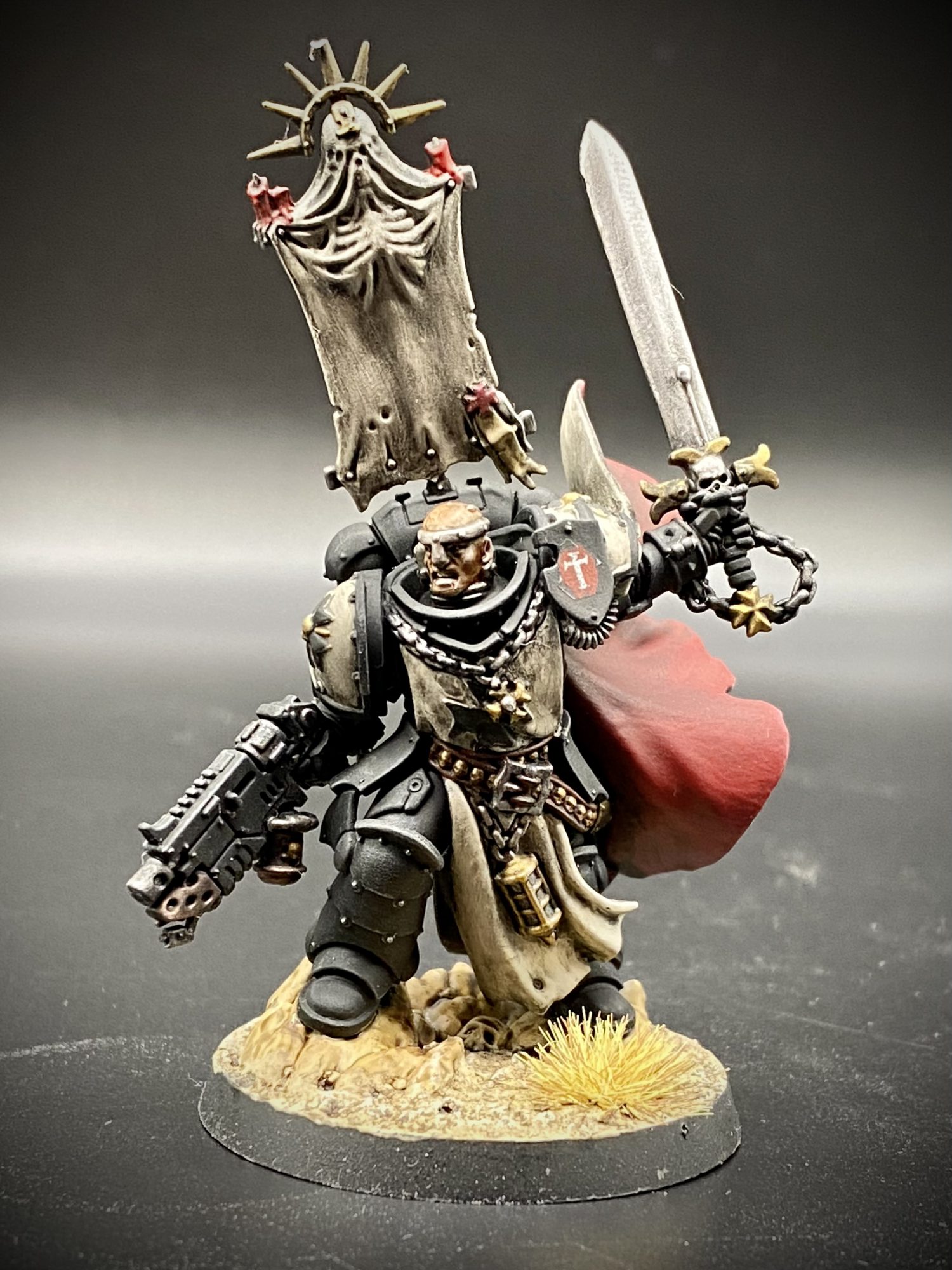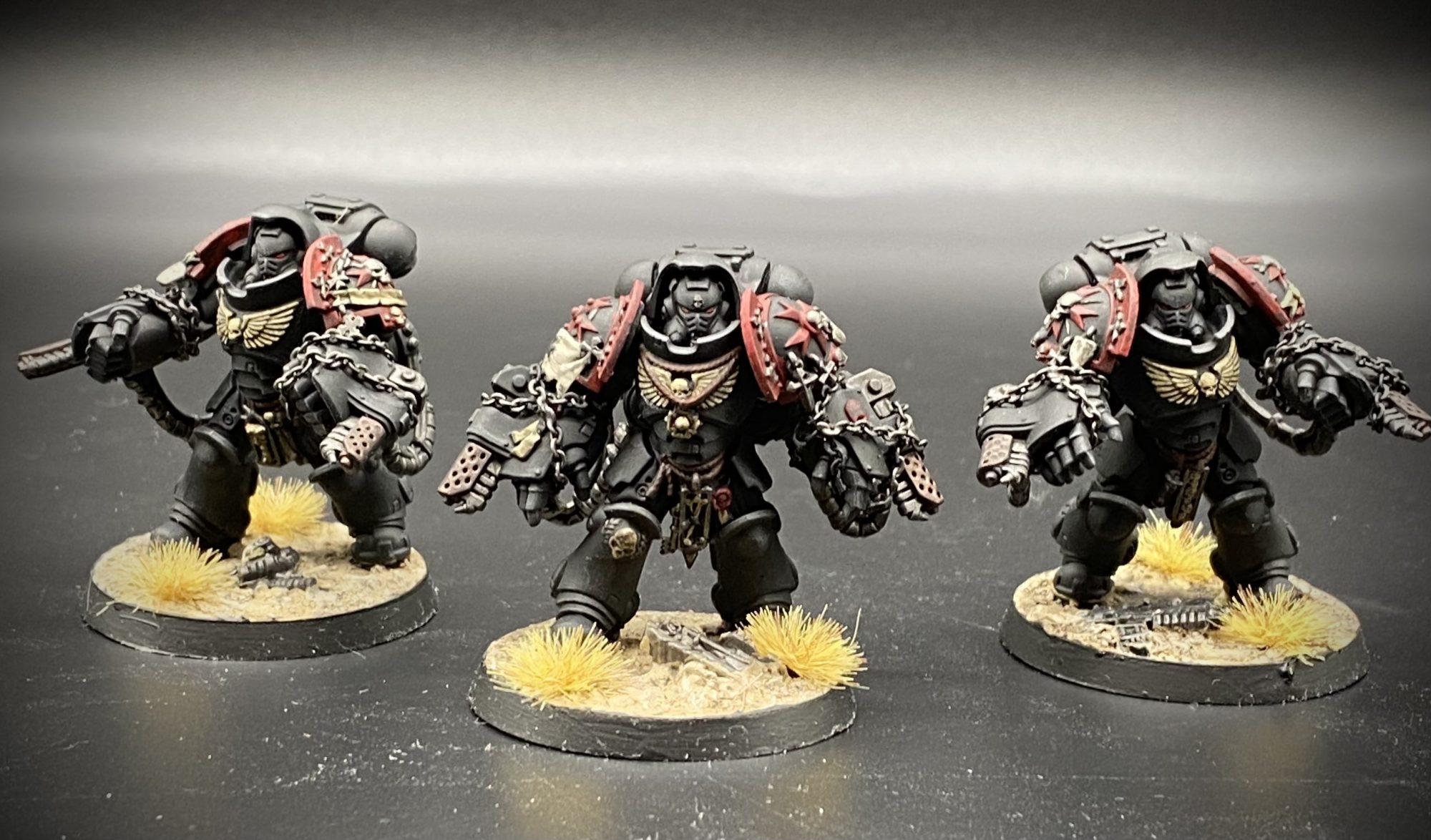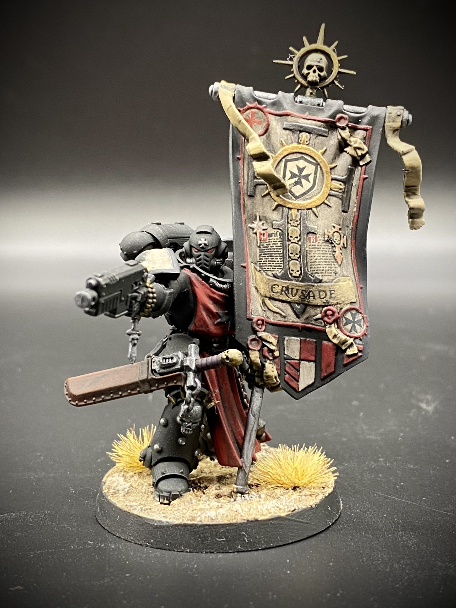 I also added reinforcements to my Black Templars with a Marshall, Ancient, Crusader Squad, Redemptor Dreadnought and an Aggressor Squad for a Crusade Campaign. I wanted to make the non-Templar specific kits try and match the aesthetic of the nice new Primaris ones as much as possible, so added some 3D printed shoulder pads from Archie's Forge as well as the body for my Ancient and just had to add chains on all of the weapons!