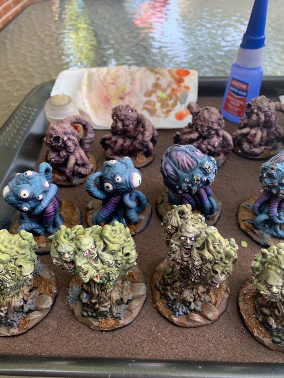 I printed and painted fifteen Chaos Spawn this month (yeah, I'm one of those Death Guard players), which I batch painted and knocked out pretty quickly. I color-coded the units to easily distinguish them. They were done 90% with an airbrush and then I picked out some details with a brush. Yes, that one is intentionally cross-eyed. Chaos makes you crazy, I guess.