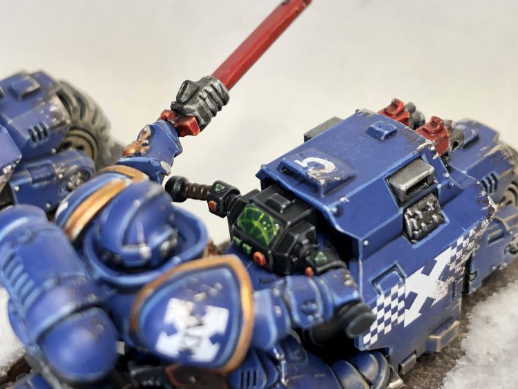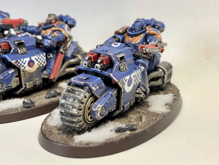 Ultramarines Outriders. Credit: SRMI started painting these guys like the old 3rd ed box art, as that was my first plastic Warhammer kit. However, I got this notion that I could use those big strips of checkerboards to make racing stripes along the sides of the bikes, and put the unit markings over them: