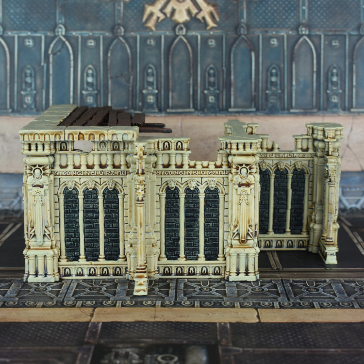 Credit: Robert "TheChirurgeon" JonesI also put a bunch of work into getting some terrain ready for a game this past weekend, doing some overtime hobby work adding bases and some quick coats of paint to these features. In total this was four ruins (the two big ones in the middle in the photo below, plus the two on either side with bases) plus six munitorum armoured containers.
