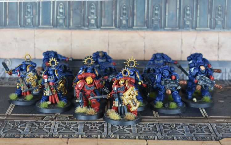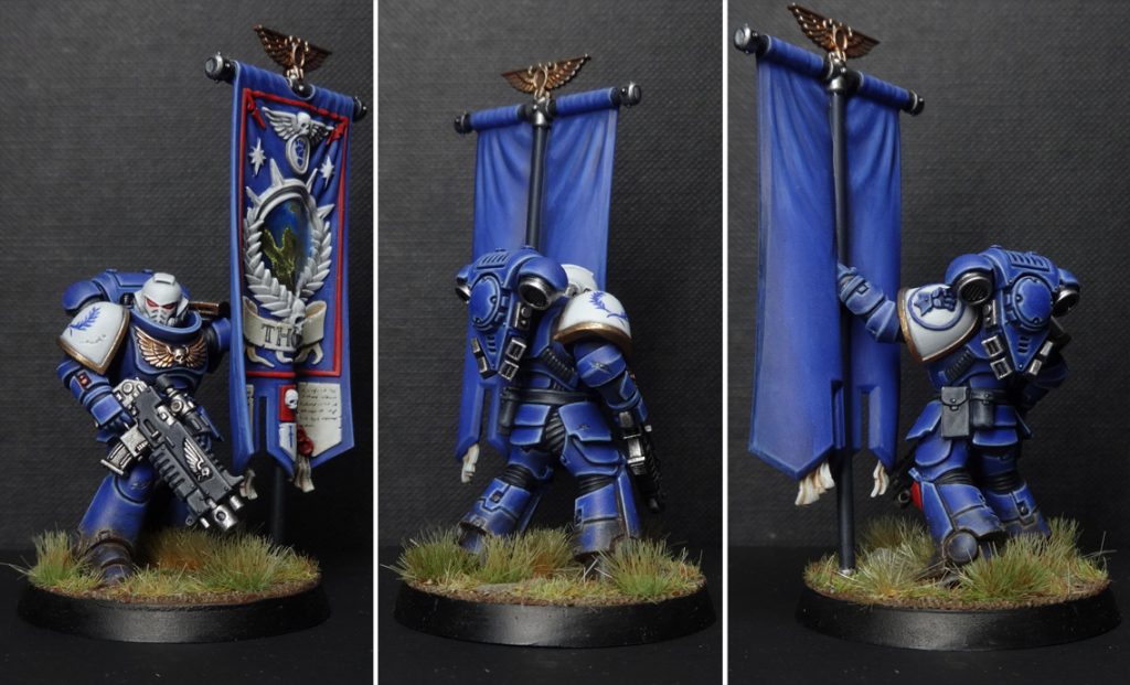 I shall now answer all the questions you didn't ask about the heraldry. I figure the two star symbols on the banner represent Thonis’ two moons, Adelfos and Adelfi. The red trim is because it’s the Third Company’s banner. The bottom center panel is the captain’s personal heraldry; the Ultima symbol is a callback to the fact that Lucullus, the 3rd Company Captain, was in the Ultramarines before he was sent to help found the Cobalt Scions. The sword symbol marks him out as the recipient of one of the master-crafted power swords given to the four Ultramarines who founded the chapter.
