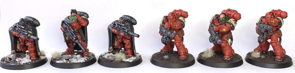 Red, white, and black are colors already present in my scheme, so rearranging them to give the squad some unique heraldry that fit is a challenge that gets slightly more difficult with each squad and their individual heraldry. Repeating those heraldic colors on their weapons is one of my favorite touches as well, and a great way to differentiate between units on the tabletop.