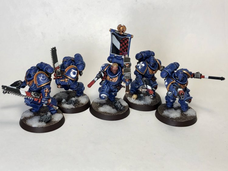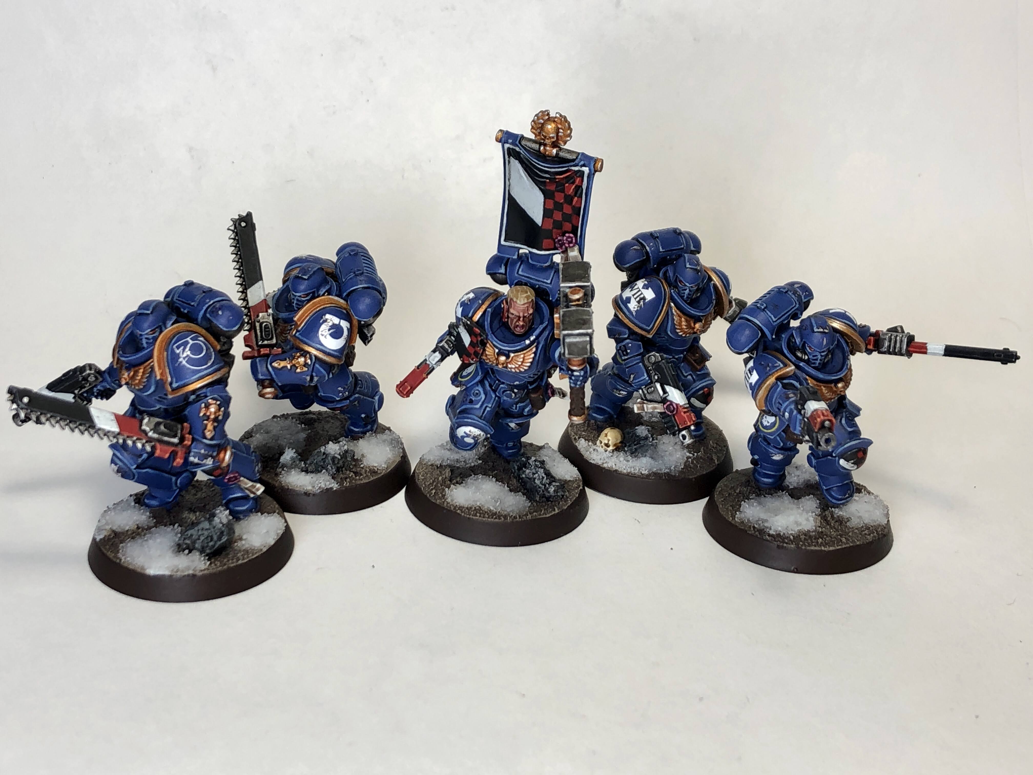 After vacationing in The Old World and Le Vieux Monde over the past month or so, I'm back in the 41st millennium and working on my Indomitus bois. Instead of going for the hot new characters or ass-kicking elite units, I got a start on the humble Assault Intercessors. After working out their unique heraldry, I fell right back into the Ultramarines-painting groove.
