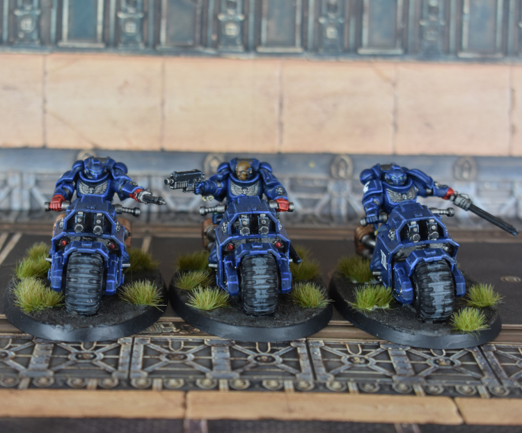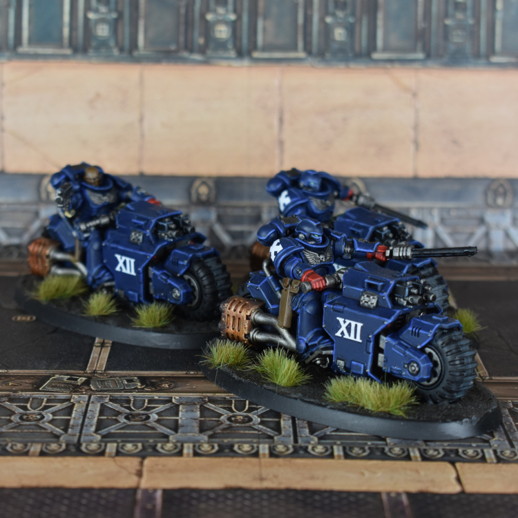 I also used a healthy amount of transfers to personalize the squad (you can learn more about how here on goonh ammer dot cum) and apply some campaign and unit markings. I think I'll carry the assault lightning bolts and campaign skulls over into more Indomitus models, or at the very least the other Assault Intercessors. Next, I've got the Outriders and Eradicators built, so expect one or both of those units end of month, depending how much of a pain painting bikes turns out to be. History suggests that hubris will be my undoing here, and that I'll still be highlighting tires on Labor Day.