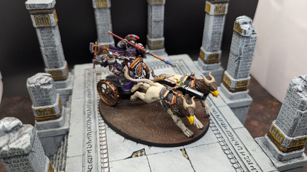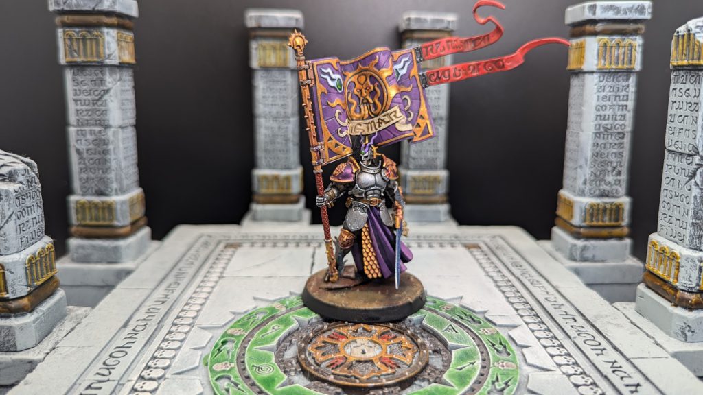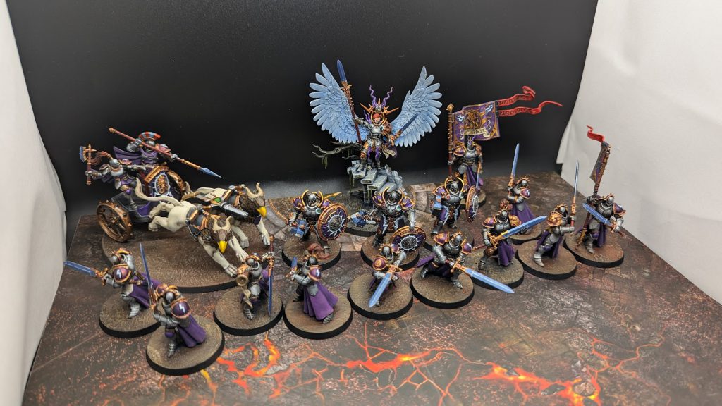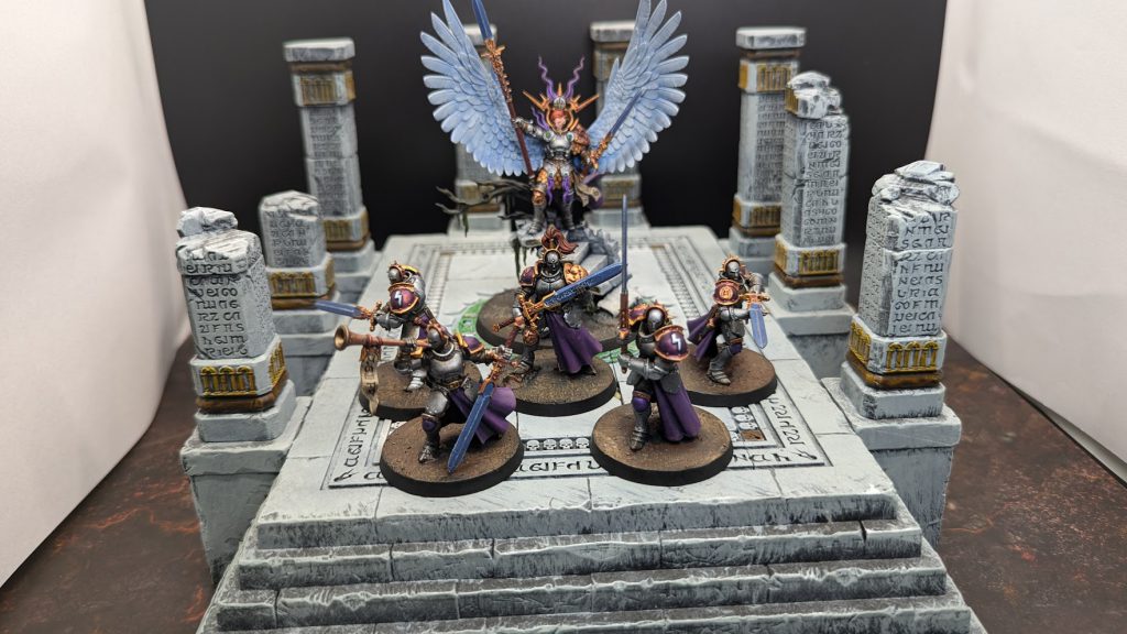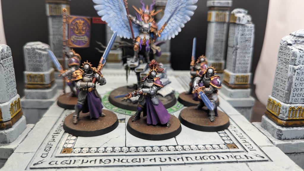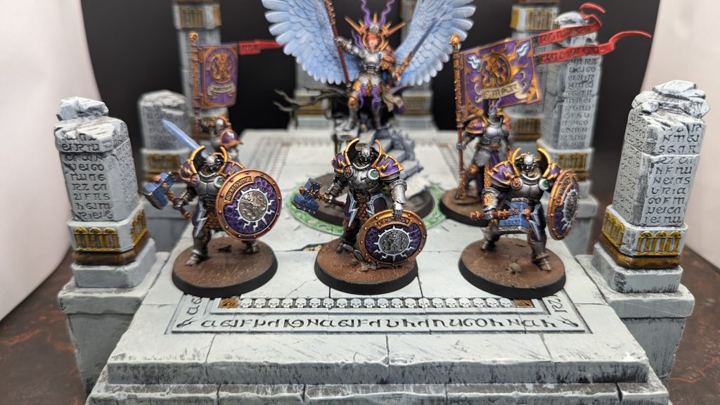 Yndrasta's Spearhead. Credit: Kevin StillmanWhile at SDCC, I decided that I would spend my downtime doing one of two things: Indulging in my Hotel's waterslide, and painting Yndrasta's Spearhead. Yndrasta is the coolest model in the Stormcast Eternal range, in my opinion (1), and I like Spearhead, so this was a logical choice. I went with the Blades of Dawn Stormhost, as there is a relative dearth of these minis around, and I like the combination of rich purple and rich gold with cold, weathered steel. This would give me a new Spearhead to play at NoVa or the Grand Narrative.