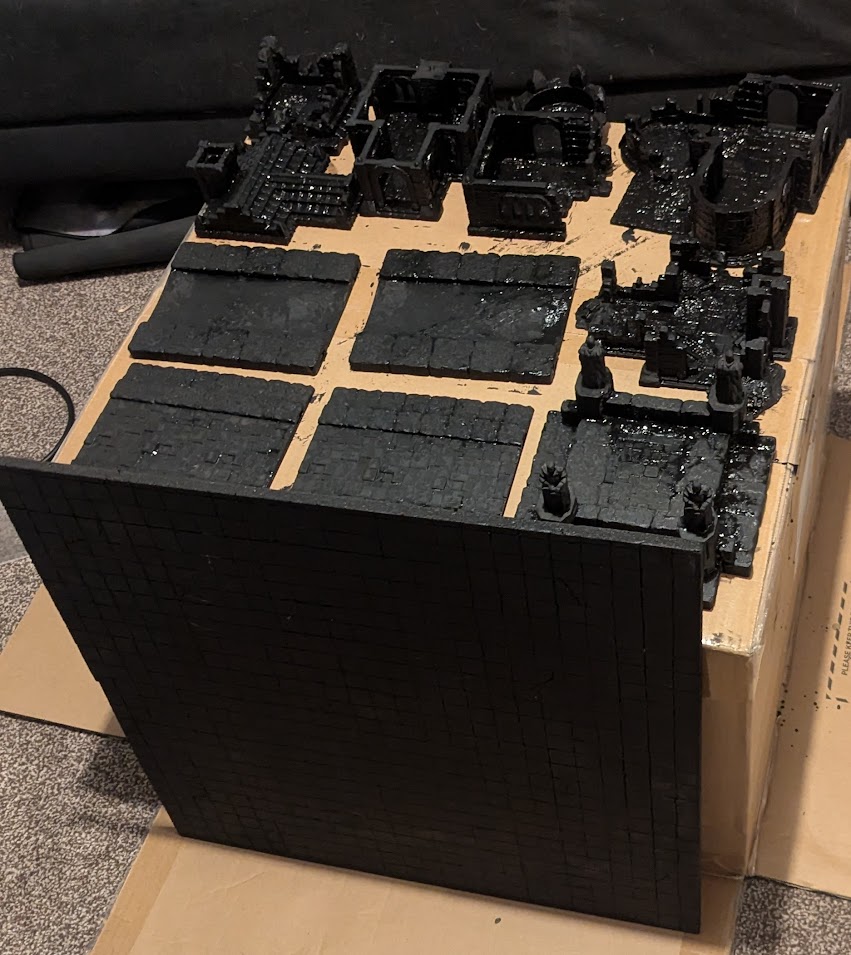 Osgiliath board WIP. Credit: Rich NutterThis project was perfectly timed with receiving the files from Conquest Creations' recent Kingdom of Tor Ithilas Kickstarter, which I backed a couple of months ago. I printed off some roads, rivers, and a bridge, then set about making a board for them. As it didn't need to travel far the board is just 6mm insulation foam, with a tile pattern scribed into it and then painted with a big brush and black edges. The terrain itself got a Colour Forge Ghoul Grey spray, then a variety of washes and unifying drybrushes for that Osigiliath stone colour. The river got a wet blend from blue through to black, then a quick layer of Ardcoat gloss varnish. Not fancy resin work, but it would do.