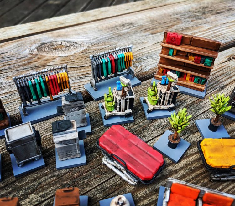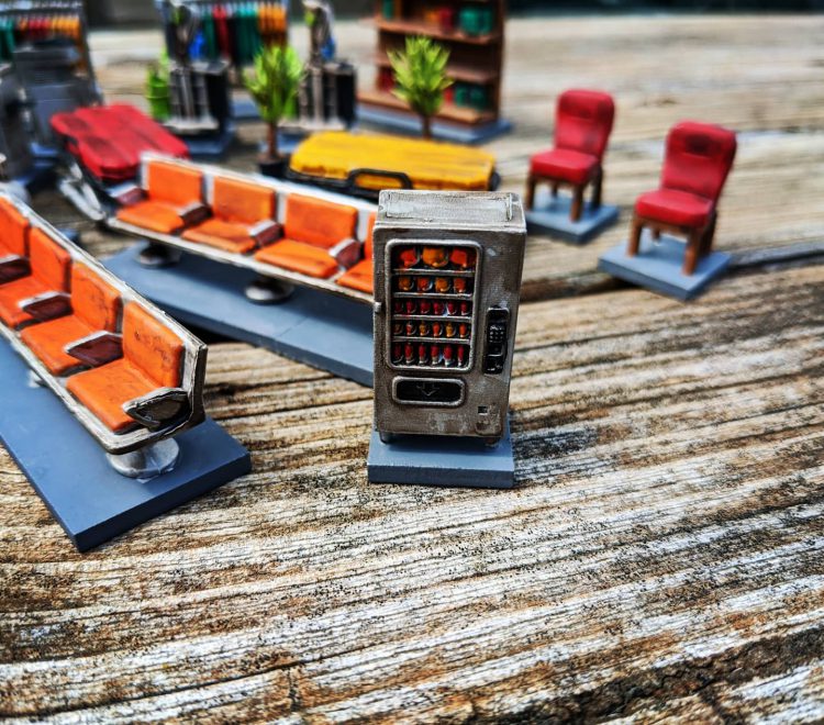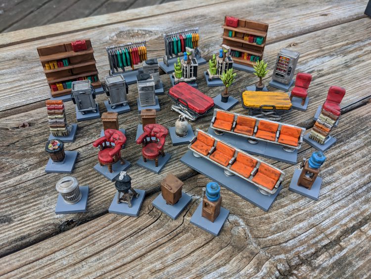 I received my Terrain Crate in the mail from Mantic a few weeks ago and I've been slowly plodding away at painting stuff. These are 28mm scatter terrain pieces mostly for shopping malls, offices, and camping sites. I'm about halfway through of the pieces I bought in the Kickstarter.