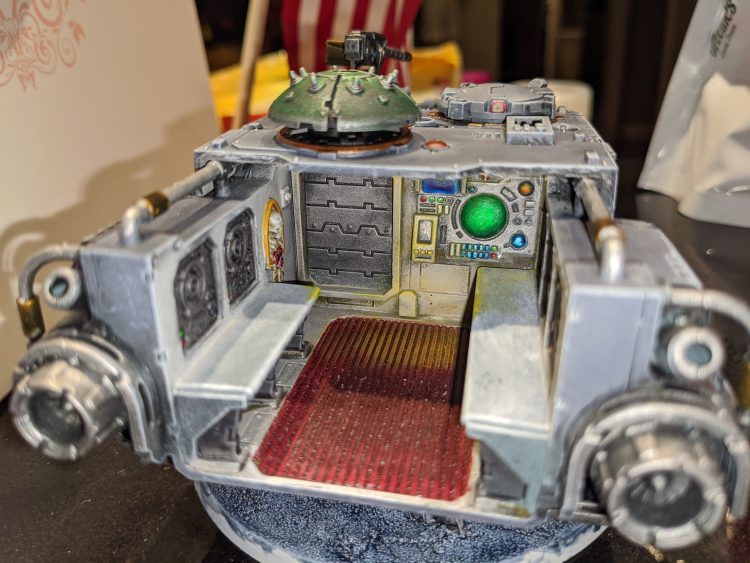 I painted the Impulsor soon after I finished the Rune Priest, and started with the interior. After all, the hull is going to be varying degrees of gray - so why not have some fun with the colorful rear compartment? I tried an OSL with the bare bulb on the ceiling of the overhang. It's limited and yellow, because I figure the Space Wolves aren't quite as good as replacing dying lightbulbs as, say, the Ultramarines would be.