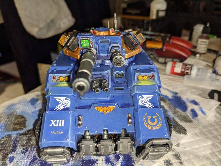 After priming this model black, I then gradually drybrushed my way up the model and from dark to light. I initially painted the model with Valejo Game Color Stormy Blue, before using a blend of Stormy Blue with the Citadel Air version of Macragge Blue. The air version is much, much thinner than the regular version, and thus when blending it with a makeup brush, the blend will be much smoother. I eventually drybrushed my way up through Fenrisian Grey. The Stormy Blue basecoat gives the blue of the rest of the model a bit more of a deeper bite than the Citadel Ultramarine Armor gives, in my opinion. Of note are the Repulsor plates, which were....challenging to assemble. They don't stay on very well, they're time consuming to build, and overall annoy me. I'm glad that the next series of hovertanks released by GW had better methods for doing the hover plates. After I finished my Repulsor, it was time to start on Indomitus