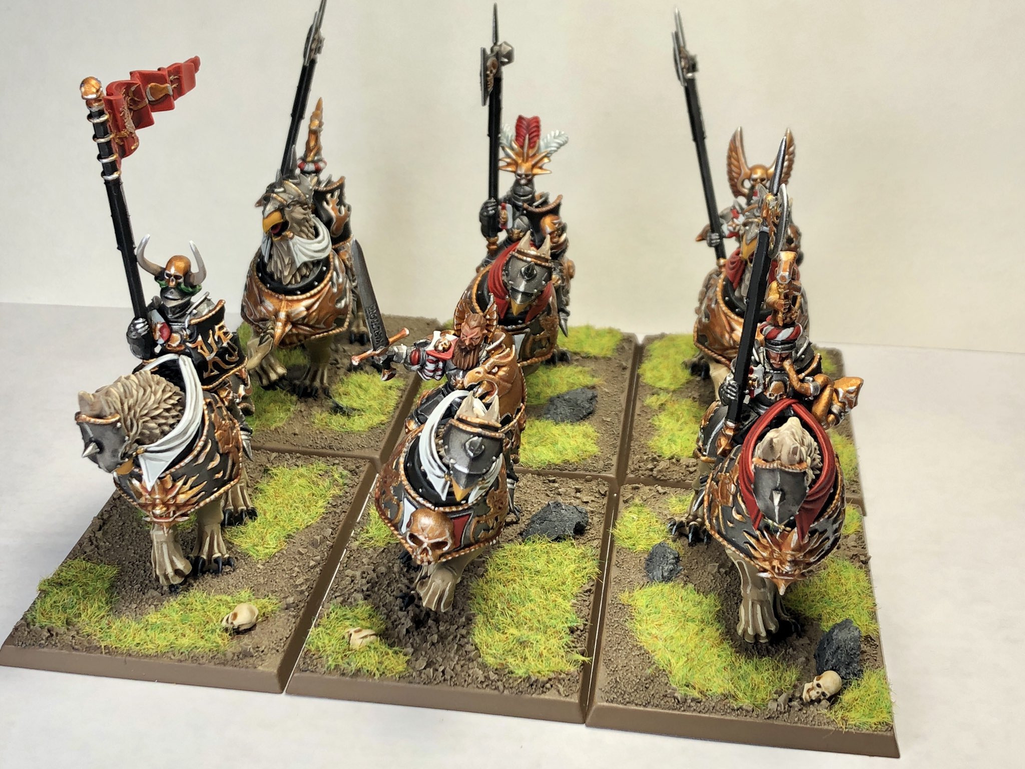 I fleshed out my Demigryph Knights! I had painted the first three with white sashes and did up the second three with red sashes to really tie into that Talabheim theme. Turns out I'd painted just a regular jobber instead of the musician in the first batch, so got around to him so I could flesh out the command section. I didn't really like the single helmeted barefaced head in there, so I gave him a head from the classic Empire Knights that I still have like 20 of. His moustache just looks so jaunty!