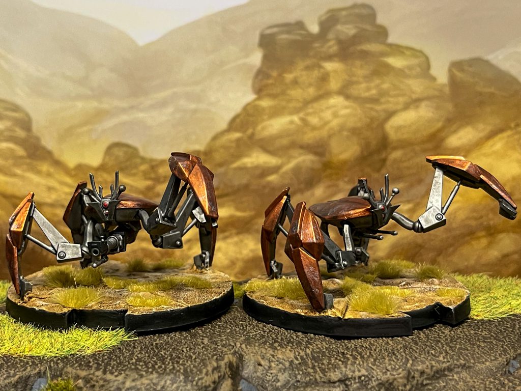 Star Wars Legion Separatist Crab Droids - Credit BairAnyone familiar with droid kits knows that they take about twice as long to build than they do to paint and that is absolutely still true of both of these. I really need to get a desert hill for some more fitting photos. The Crab Droids especially I kept staring at reference pics thinking that thereĀ must beĀ more detail to add and there just....isn't. They're simple. I love that. I went for a metallic finish though instead of the weird matte orange one on the box art, it felt more correct and that copper with a shade is just gorgeous. Battle damage was a necessity. The Aqua Droids are equally simple being just a few silvers, a Darkstar metallic blue, and a dark grey for joins and guns before a nice thick wash is slapped all over.