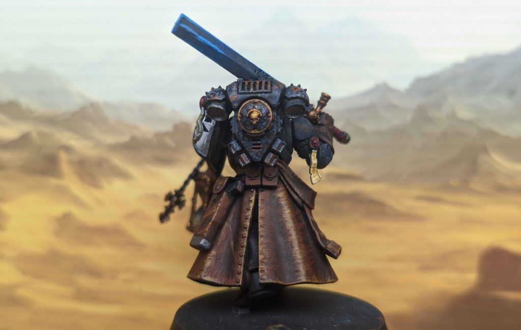 Lars, the Heir to the Choir. My Judiciar in Crusade, and an absolute monster. Painted by Josh Boyes, Jon Hodgson BackdropsI've nearly entirely switched to Pro Acryl for my paints and the coat leather was a good way to finally utilise all the warm-browns I've collected.Ā It's a simple effect of scratchy, layered highlights moving into ochre and then glazed back down with a red-brown. (in my case, Reikland Fleshshade for it's semi-gloss finish to contrast against Pro Acryls matte finish)Ā It immediately pops and looks great on the table, which is exactly where he was next day leading me to a decisive victory against some Custodes.