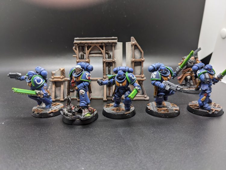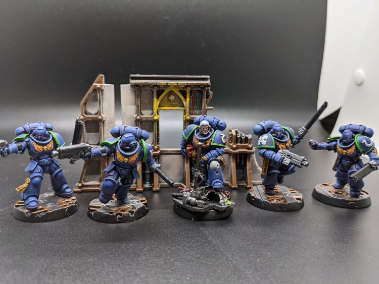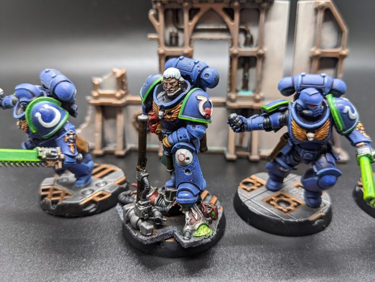 After painting Ventris and his two Lieutenants (I painted those in late February), I decided it was time to give Ventris some additional troops to command. So instead of buying a single box of Marines to build and paint, I instead went for alternate sculpts - I got the build and paint Ultramarines set, the Getting Started with Warhammer 40K magazine, and the 2019 Store Birthday Marine and combined them all into one unit. I took some bits from a few other units to make the Sergeant a bit neater.