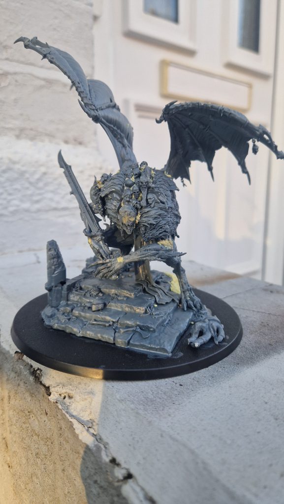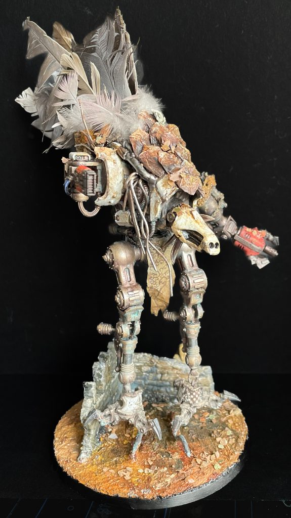 Having exorcised a lot of traumas and insecurities with the various knights I’ve painted over the last couple of years, I picked up a set of chaos armigers (whatever they’re called), with the sole idea of having some fun with movement and disgust. The first completed is, pretentiously (of course!), called rydych yn fwy, and is the joy of movement, fully articulated in the legs from hip to ankle, able to hop and skip, with bobbing head and pivoting arms, taking the play and joy of a children’s toy into the warhammer space. It can move, it does move, it will move.