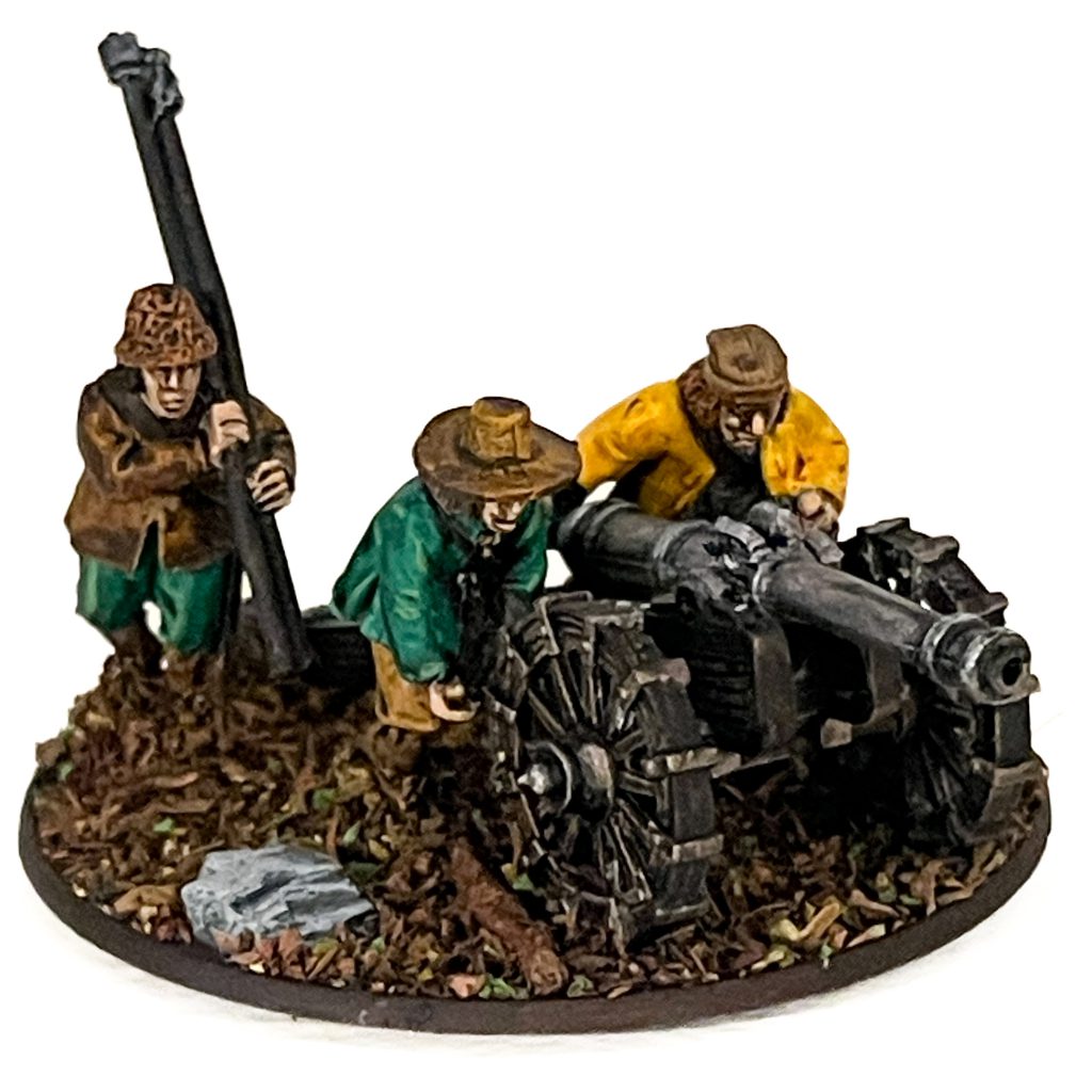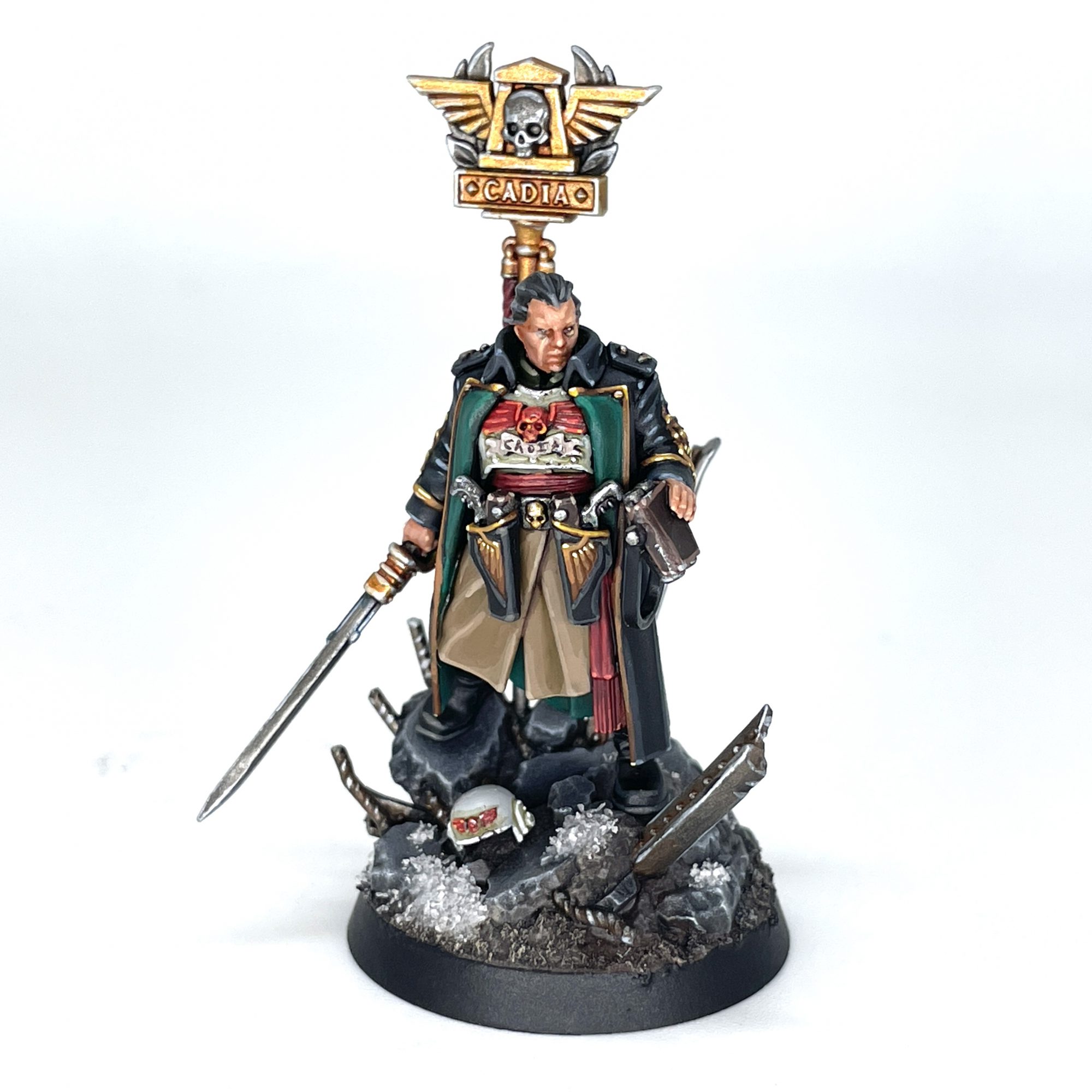 Ursula J Creed. Credit: SRMI painted up a crew of character models next, but I'll start with the best of them - Ursula Creed. In my curiosity, I found that her extremely out of place helmeted head is a reference to when Winston Churchill visited the trenches in WW1 and wore essentially the same French Adrian helmet. As Ursurkar Creed (and by extension, his daughter) are by and large references to a mythologized Churchill, it only makes sense that she'd have another reference to the ol' Bulldog. I enjoyed working in more of a rich green for the interior of her coat, which you also see spilling out on the back where it's torn up. I don't have pictures of that here, but you can peep those on my Bluesky.