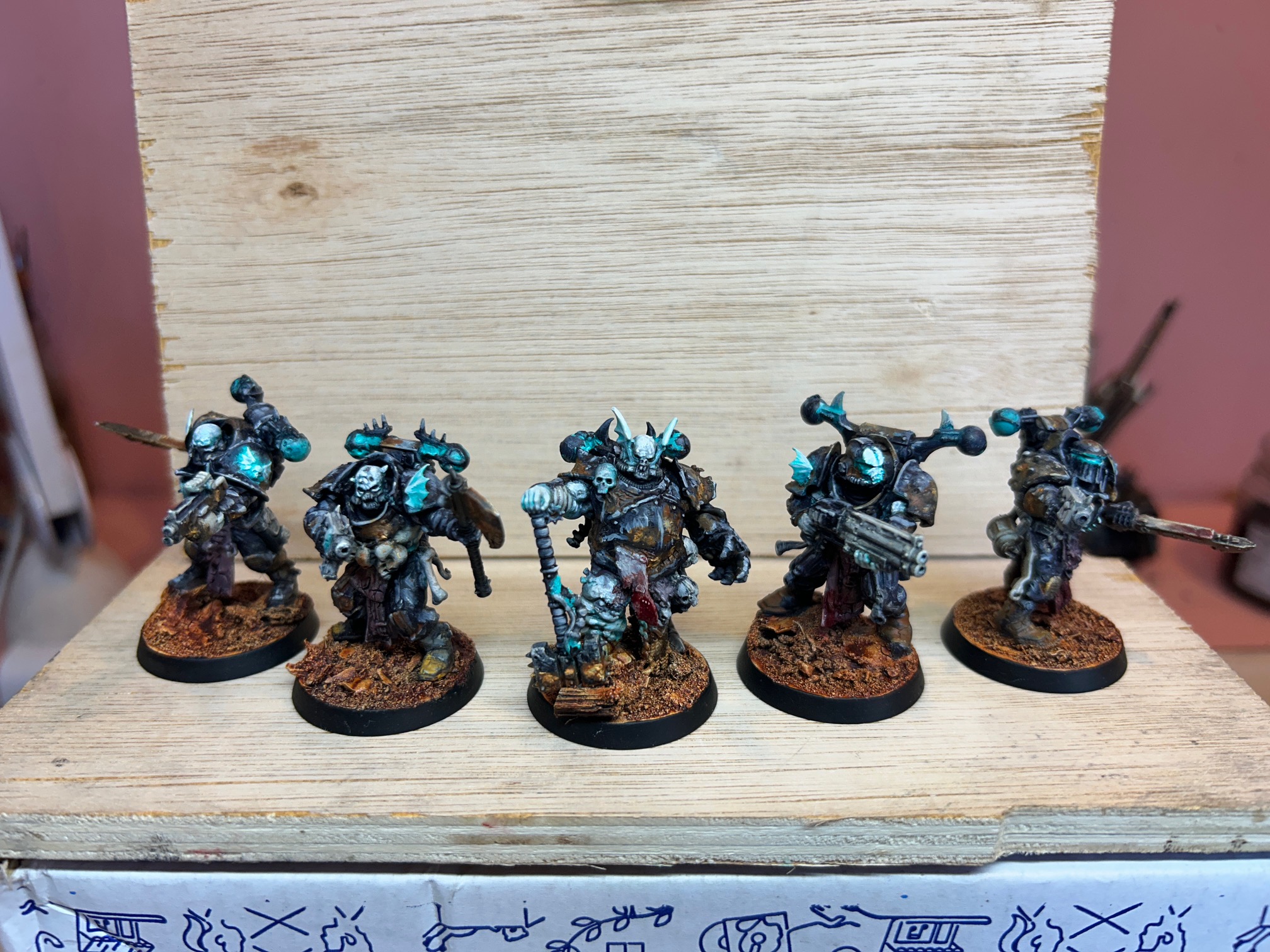 This month I've mainly been working through my Kill Team backlog. I've managed to get my Plague Marines finished, which is great because they're absurdly detailed models. I converted them out of models from the 8th edition 40k starter box, so they kind of cost me nothing... or at least nothing least recently.I tried out a "grimdark" painting style for the armour, involving putting paint on with a sponge. I think it worked ok but all the other gubbins kind of overwhelms it. They look ok though I think.