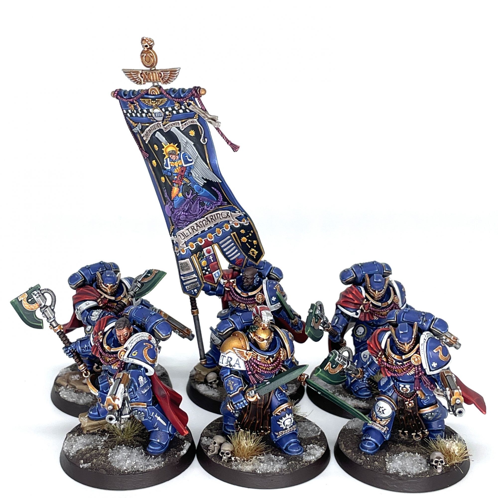 Ultramarines Victrix Honour Guard. Credit: SRMHave you ever batch painted what is essentially six hyper-detailed character models at once, plus a huge fuckoff flag? Well I have, and lemme tell you, it takes a while. Painting this six-strong unit of Victrix Honour Guard was an experience oscillating between "this is easy, it's just Space Marines" and inventing new curse words for the experience of painting behind the aiguillettes across their chests. Would you believe there's actually space behind those where you need to jam a brush to paint their aquilas? It's true! The banner alone took the better part of a week, but I'm so, so damn happy with how this entire unit came out. I wanted them done by Adepticon, and had some other goals in mind for the event as well, but a number of health crises and the loss of my sweetest cat took precedent over painting toy soldiers for much of the month. I'm back from Adepticon and somewhat over the emotional hill though, so I'll be getting back to it in force now that April's rolling around.