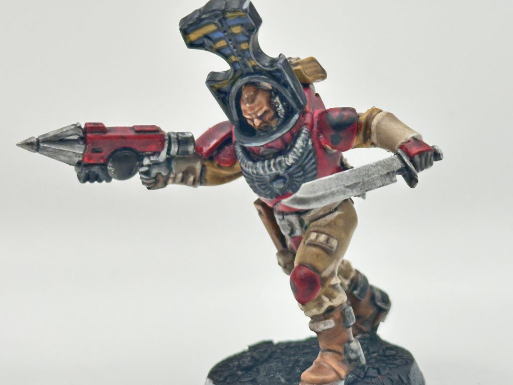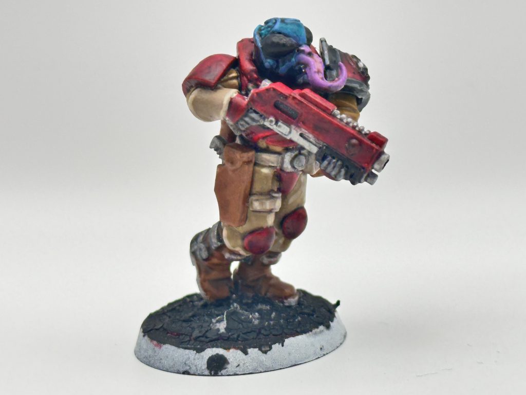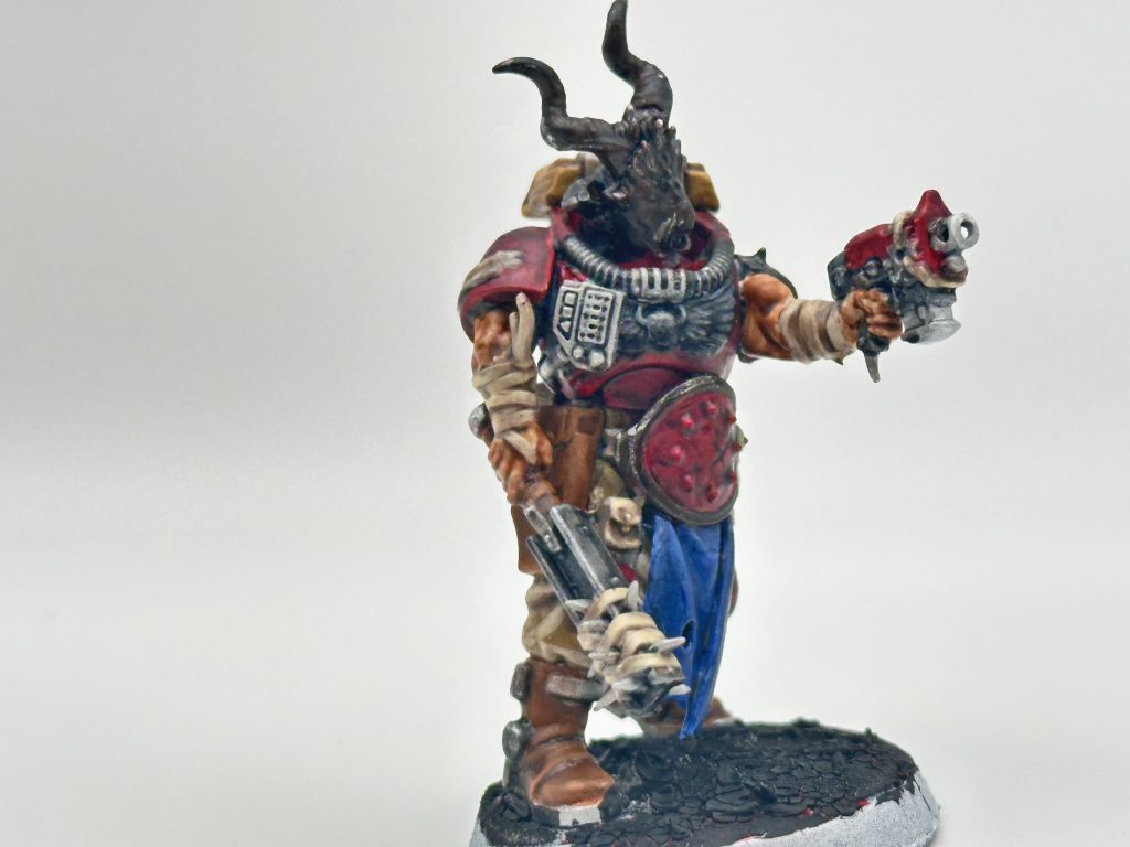 Chaos Scout Sergeant. Credit: Ezekyle CatbaddonI tend to use the Citadel (or Warhammer Paint now) when I am painting my models, and they almost always come out very well. The only real exception is the metallics, which I like to use P3. I just think their silver and bronze looks good. Trust me, the Sergeants helmet looks alot better in person than in the picture above.
