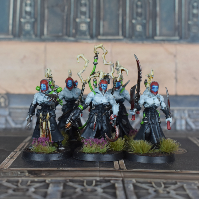 Finally I painted a whole bunch of new Drukhari. I have a large Drukhari army already, but a lot of it was painted as much as 10 years ago, and is both not that good and, in some cases, fairly badly damaged. It's also somewhat boring - ironically enough, with a black and red scheme similar to the Ad Mech one above, but executed worse. With that in mind I decided to try out a couple of new schemes for Kabals and Covens, knocking out 10 Hekatrix Bloodbrides and some Kabalite Trueborn as well as a new Archon. I also painted some Wracks I'd had waiting in the wings - naturally I finally put a liquifier on one of these just in time for the Dark Technomancers nerfs to go through. I also painted the new Lelith in the same red Cult scheme.