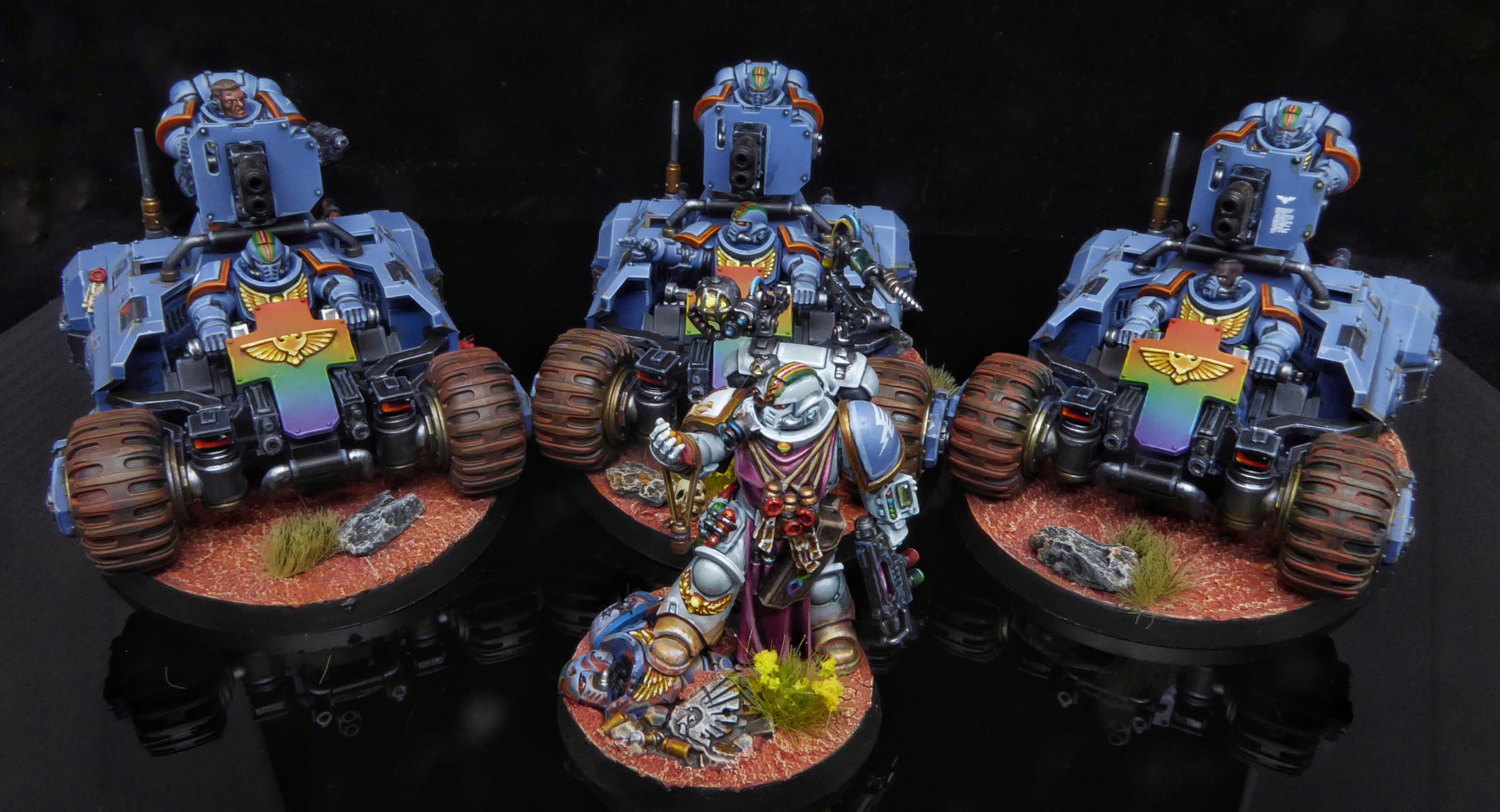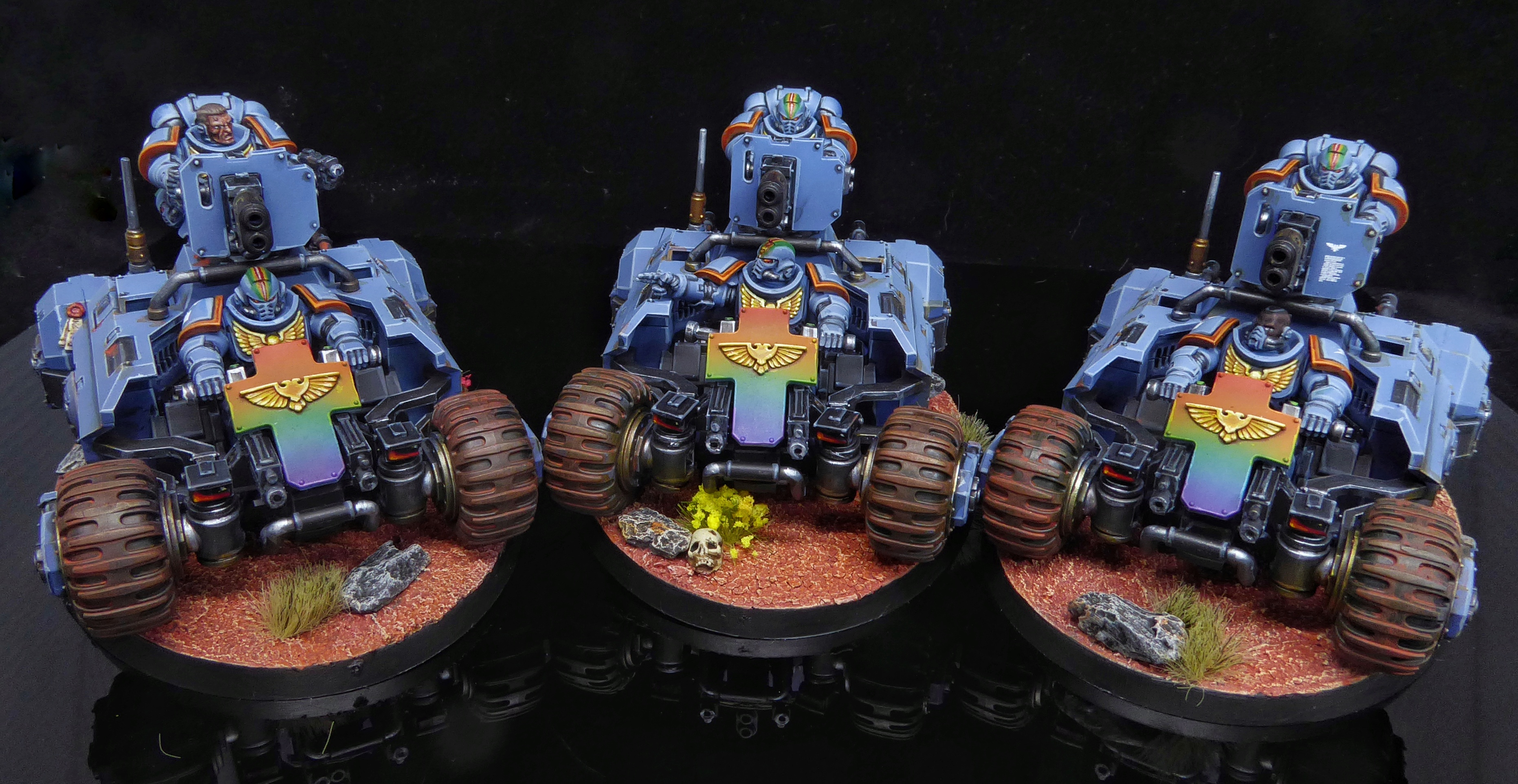 Rainbow Warriors Invader ATV by Craig "MasterSlowPoke" SniffenI've only gotten a handful of games with them so far, but they're really fun on the table. They're extremely fast with decent firepower, and 8W makes them durable enough that your opponent will need to dedicated some real firepower to get them off the board. My favorite use of them at the South Georgia Havoc was slamming one into a blob of 20 Necron Warriors, forcing them to just smack it ineffectually instead of shooting something that mattered. I took them as solitary models instead of a unit of 3, mostly to better utilize the Master Artisans trait, but I do really want to see how dumb they are paired with a Chief Apothecary.