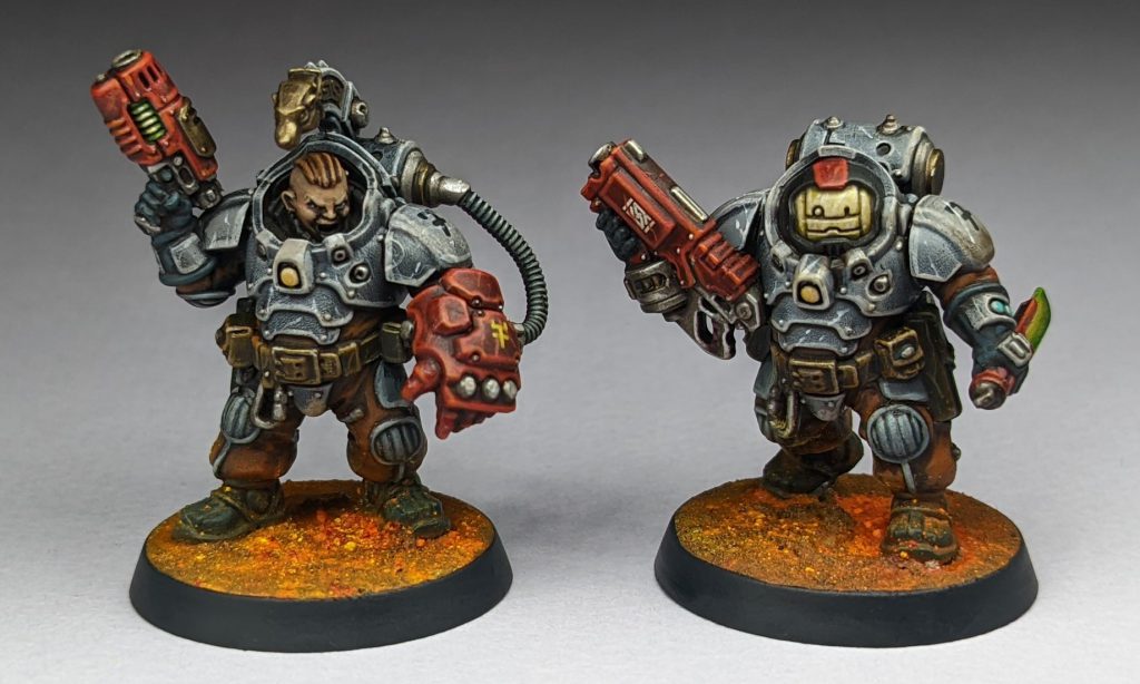 The Voidsmen are actually what excited me most about this kit. I love the Captain Keyes looking dude and I'm happy I was able to tie the colors on his medals into his uniform. I love this heavy weapons guy, and you can see how I utilized contrast for the pearly white armor on these guys rather well. I thinned Apothecary White 1:1 with Contrast Medium, ran that over my Grey Seer basecoat, then highlighted with Ulthuan White. For fabric it was thinned Briar Queen Chill instead of Apothecary White, but otherwise the same process. I probably should have done heat staining on the heavy's gun but this group was starting to take a while. I painted the doggo very similar to the box art scheme, which is like a Doberman Pinscher. It's pretty clearly what he's sculpted to resemble, and I figured I was putting enough of my own spin on this model with the armor. The cool voidsman next to him is pretty much the same as the other two, but with a cigar; something you should definitely smoke in the oxygen-rich environment of a sealed space ship. I'm impressed with the little variations in bodies on these guys and gals, as the one holding his lasgun with both hands is actually a little pudgy. Their helmets had a very 70s sci fi feel to me, and I wanted a quick and effective means of getting their lenses down, so I just used some Aethermatic Blue and turned them upside down so it would pool towards the top of their visors. It sorta worked, but the squad's done and I'm happy with the results! Their bases are Necromunda bases, as I've got some ideas for scenarios with them in that wonderful game that I'll hopefully revisit at a future date.