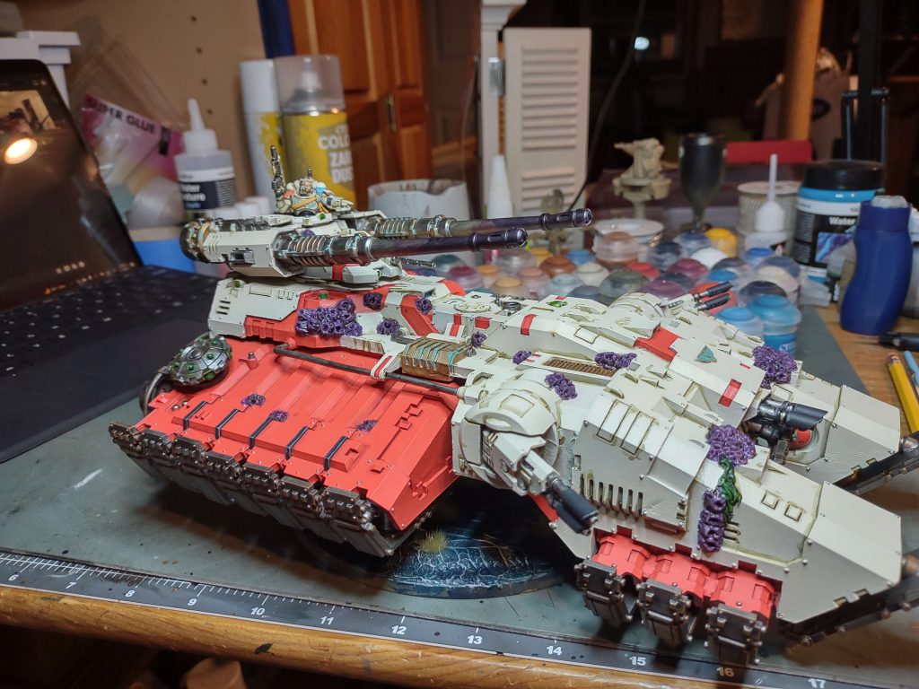 After the terrain was done I got in a mood to work on some Space Marines. I've had a pair of Repulsor Executioners lying around in a partially painted state for years, and decided that no matter how much they suck I wanted to have 2000 points of painted Space Marines and the RepEx was the easiest way to get there. After multiple attempts to get the purple right I'm pretty happy with where this tank is in terms of progress. There's a lot more to do but genius me decided to sign up for a RTT in two weeks so I guess I don't have a choice but to do it.