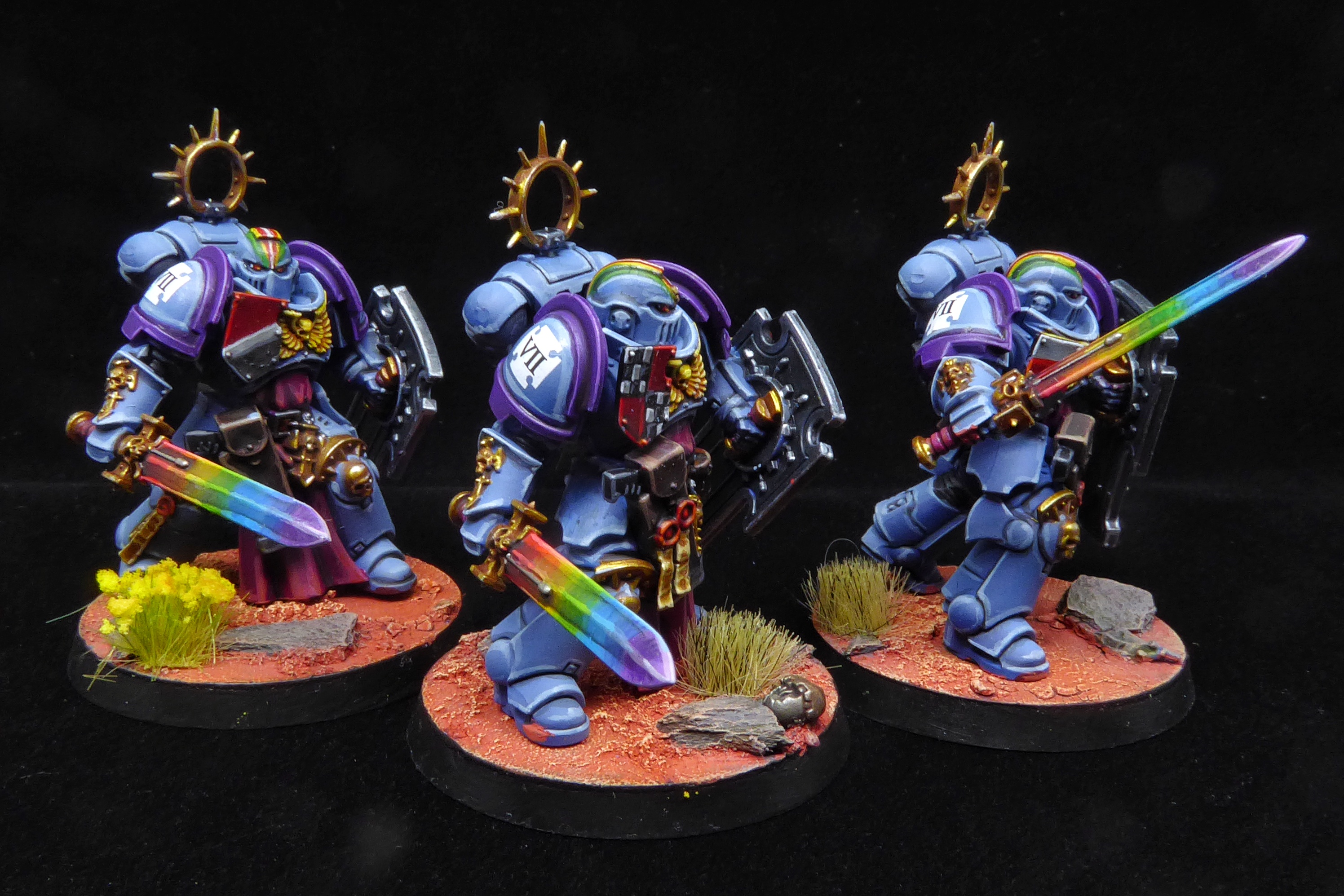 I knew these models were detailed, but wow did they take a while! I knew that I wanted to steal a page from my friend SRM's excellent HTPE Heraldry article for the tilting plates. It was a lot of fun doing the checkers and I should be doing more often! I've decided that all master-crafted power weapons in my army will be done with rainbows, natch. I still need to get the hang of glazing, but every time I try it gets a little better.