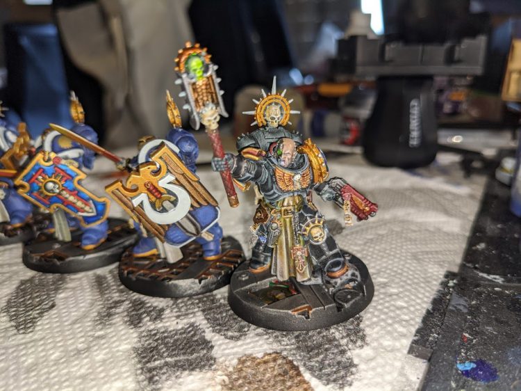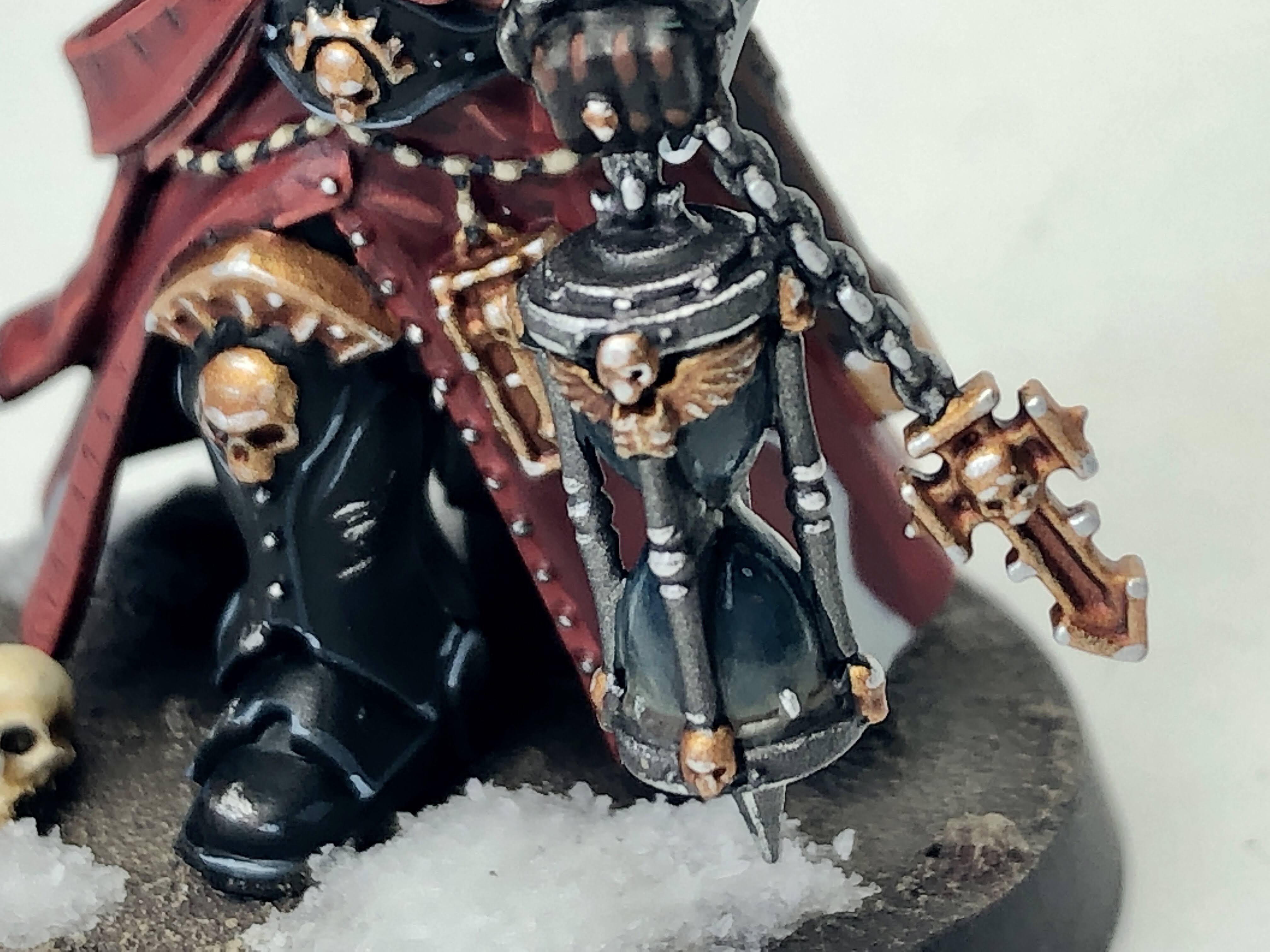 I kept the paintjob on him pretty simple, as there's just so much damn detail on him that I didn't have room for much more. I still gave him hazard stripes on his gun because of course I did, but he was a refreshingly straightforward mini to paint for all the detail on him. I'm also real happy with how the face came out, but if I never have to paint that textured crozius grip again it'll be too soon.