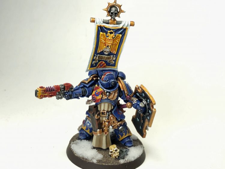 OK, so, with regards to the Bladeguard Ancient: Taking a whole Space Marine skeleton into battle is deeply, deeply, deeply silly unless 1) You are a Chaos Knight 2) You are a Chaos Marine 3) You are a Space Marine and still have the skeleton inside you. So I cut off the skeleton and the hand held by the Ancient, and replaced it with a standard from the 30K Guilliman and a book I forgot to put on my Phobos Librarian. This makes the model overall less silly, because carrying around a holy book like a lunchbox is less silly than carrying around a full skeleton.