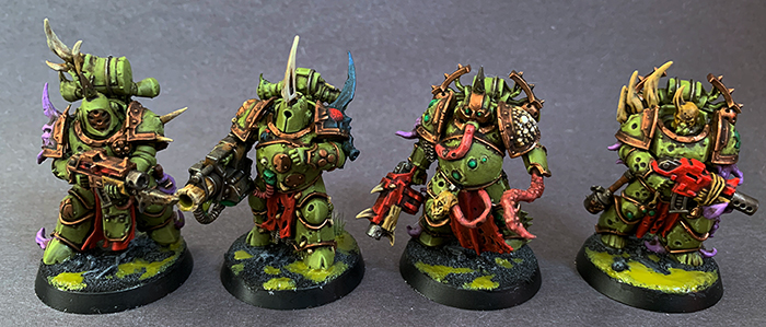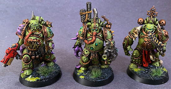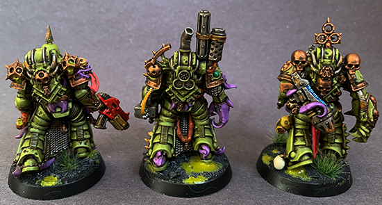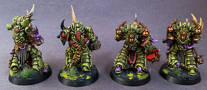 With the addition of this unit of Plague Marines, my Death Guard army officially comes to a close. At least I thought, since I'll very likely be picking up a Lord of Virulence as soon as it hits stores. As I ran through the last of my bitz, I took some time to do some minor kitbashing to get some varied looks. Death Guard remain my favorite faction for hobby work, there's just so many interesting details and options.