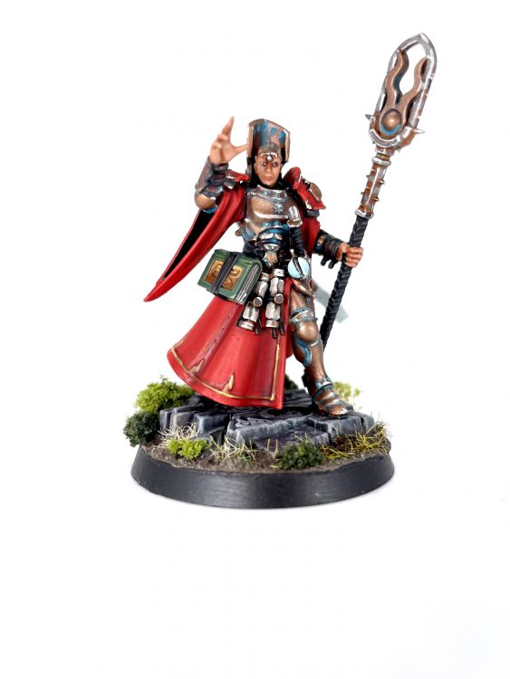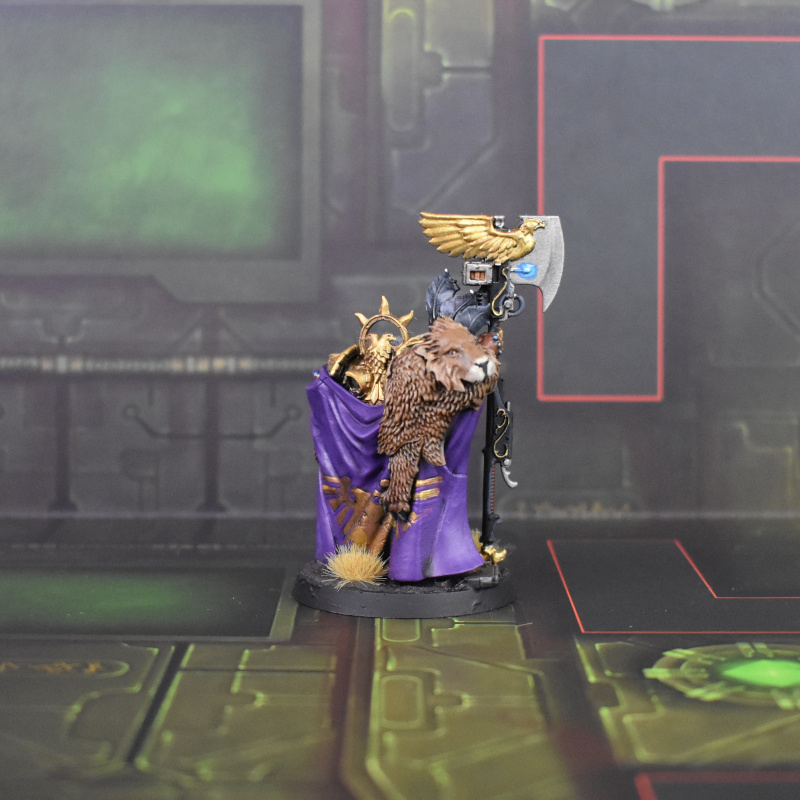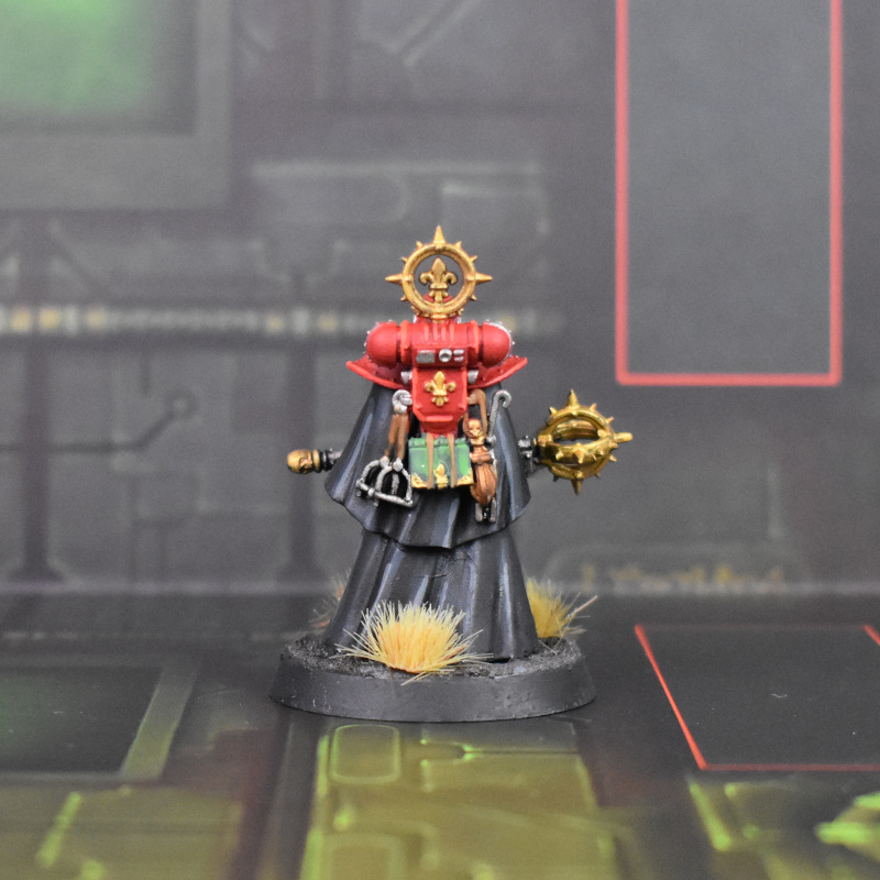 I fucked up slightly on this one. While unhelmeted heads are the cool move 90% of the time, the Knight-Arcanum deathmask is extremely fuckin cool, and I didn't realize I'd used the bare head until the primer was already dry. There were also some gnarly gaps on the cloak that involved sprue goo and green stuff to fix. All that aside I think she looks fine, and I'm very happy with the NMM gold on the book.