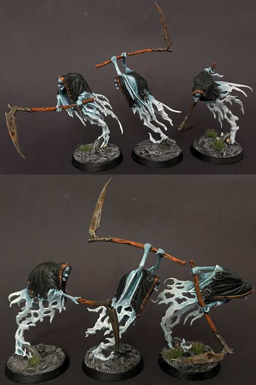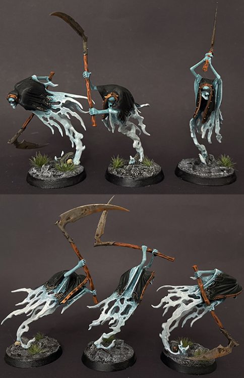 Well, folks, it's pre-October which means everyone is making every excuse to release the ghouls and goblins early. For that reason, it's back to Nighthaunt for me! First off, I've finally dragged myself out of a painting slump to finish off my Grimghast Reapers which had been sitting at my desk--MOCKING ME--for ages. Even though the paint scheme is basically my standard ghost-look by now, there was something particularly draining about them. Maybe just that they were bigger without much added detail?