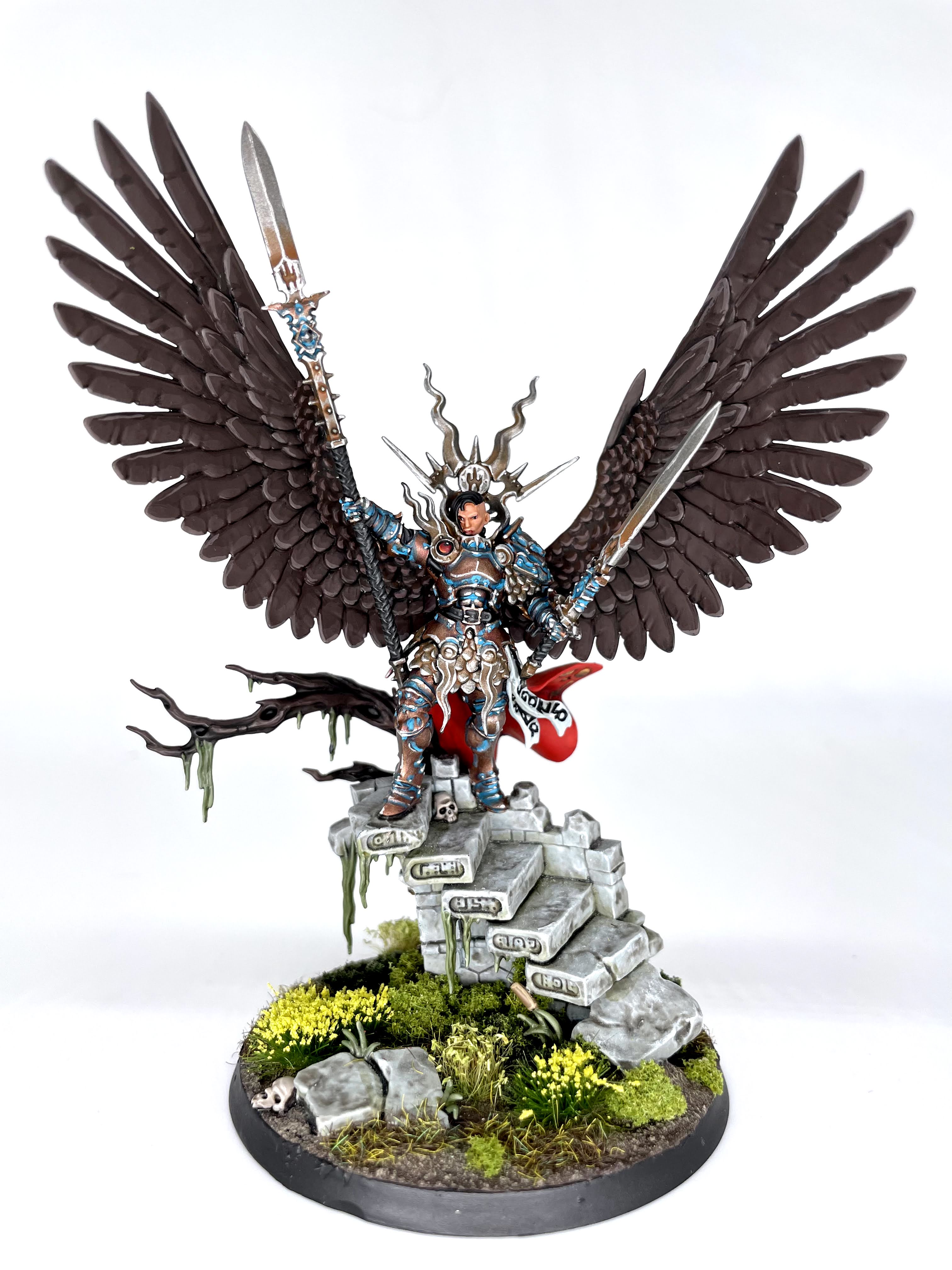 I saved the Biggest Damnedest Hero(st) for last, and I'm glad I did. While the process of layering up each feather was tedious, I'm very happy with the end result I got on her. There's a little weirdness with the sculpt where her eye and collar of her armor get a bit muddy, but aside from that she was great fun to paint. I had to paint the wings separately and found attaching those after the fact to be tricky, but not as tricky as painting around said big birb wings. I also figured out a white stone recipe that was fun and easy for her Hero Stairs, so if I get any of the new AoS terrain I know how I'll be painting them. Anyway, with Yndrasta done, my Dominion box is complete!