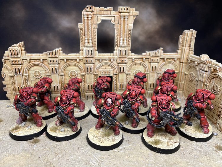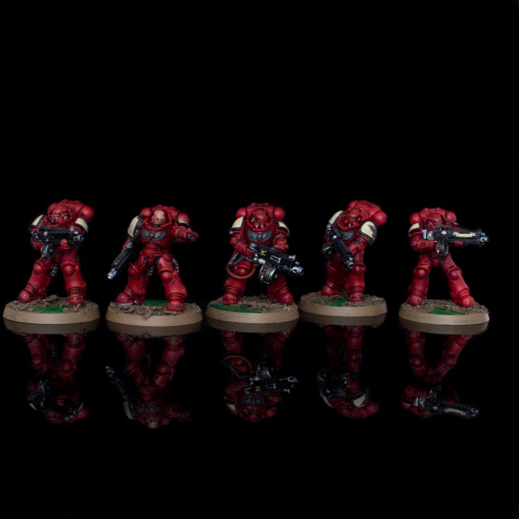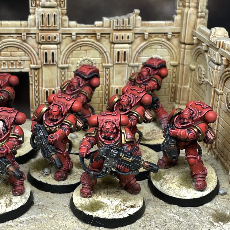 To finish up my Blood Angels' reinforcements: 6 Eradicators with Melta Rifles from Indomitus, and another squad of 6 with 4 heavy melta rifles and 2 multi-meltas from the multi-part kit. I love painting Gravis armor, and these chonky bois should ensure that I won't need to look too far for whatever anti-tank needs may arise in the future.