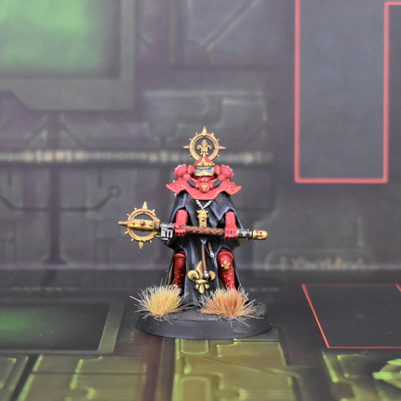 Blood Angels Primaris Librarian. I'm not a fan of the Primaris Librarian sculpt and I had duplicate characters from Indomitus, so I decided to mimic a kitbash I saw somewhere on Instagram (sorry, I don't remember where!). I used the Bladeguard Ancient model, kitbashed with a Grey Knight force stave, head, and left hand, to get a Librarian in a powerful, but passive pose. I love this model!