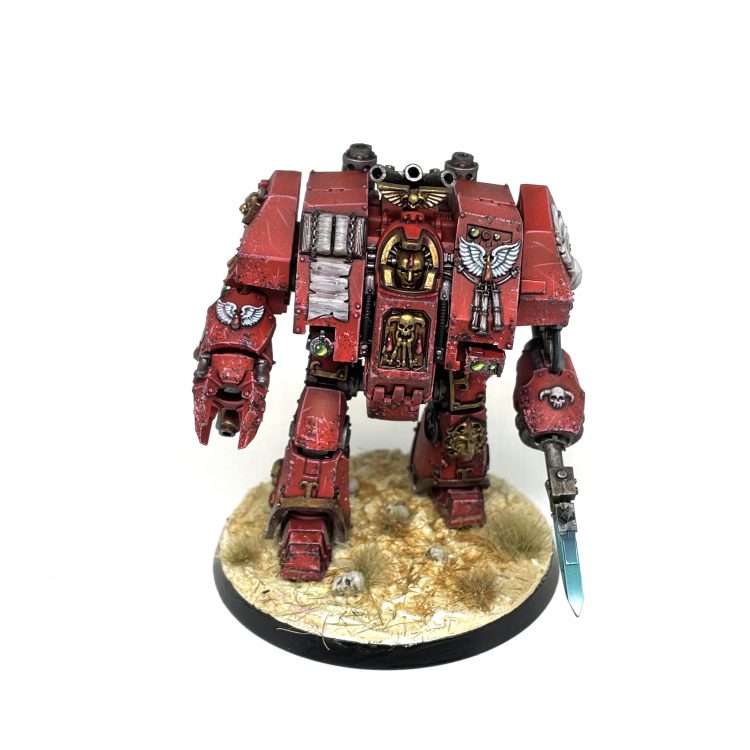 I started the month by finishing off a Librarian Dreadnought for my Blood Angels. I wanted to give the model some more height as it will have to serve alongside Primaris Marines, so I kitbashed the torso of the Librarian box dreadnought with the legs from the Blood Angels Legion Contemptor Dreadnought from Forgeworld. This gave the model just enough added height to hold its own among the bigger Marines and Dreadnoughts.