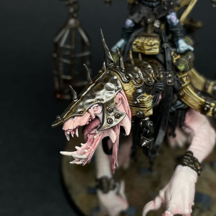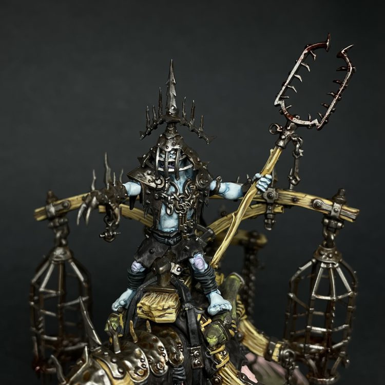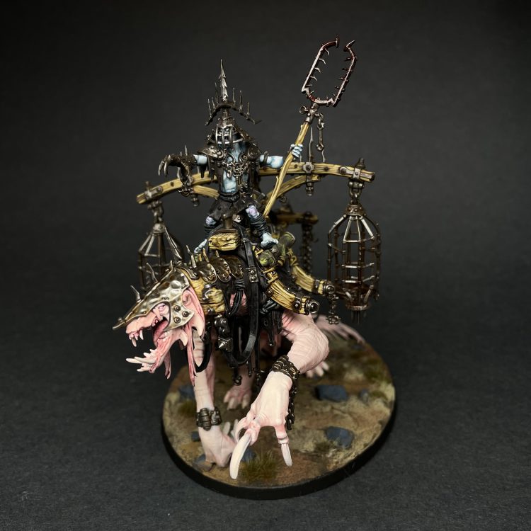 Swamboss Skumdrekk on Sludgeraker Beast. This is one of my favorite models that I've painted this year. I love this weird, creepy thing. I wanted Skumdrekk to stand out in the army, and so I decided to give him a rare albino mount. In an army full of cold, drab tones, the shocking light pink flesh of the albino Sludgeraker Beast really stands out, as well as just being creepy and unsettling to look at. Painting albino skin was a really fun challenge, as was all the woodwork on the model. The sculpting of the gibbet rig is really impressive, as there was clearly a LOT of thought put into just HOW all those different elements would be constructed to make a contraption capable of carrying not only Skumdrekk but a trio of gibbets for his unfortunate quarry. I'm very much looking forward to getting a second kit to make into a generic Snatchaboss on Sludgeraker beast, but I think there's a giant swamp vulture in my future first.
