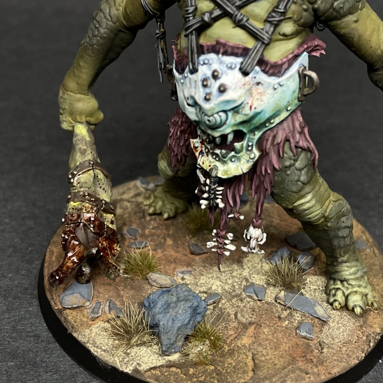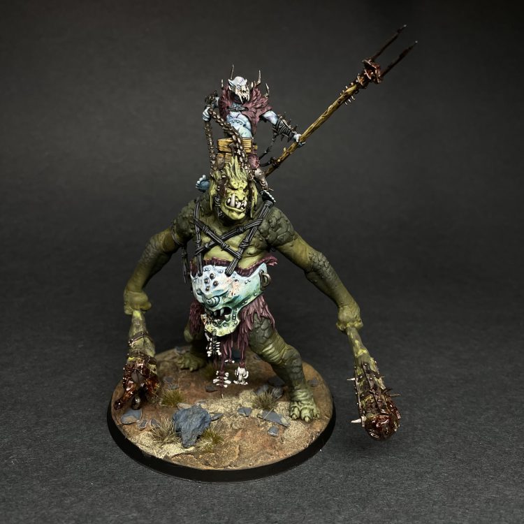 The other model I got to paint was the Breakaboss on Mirebrute Troggoth. The Troggoth gave me another opportunity to experiment with bestial skin tones, and I decided to go a more traditional swampy green flesh for the mount. I love the giant gut plate and the rider's perch, as well as the tree trunk clubs that the Troggoth is wielding. Again I put an emphasis on natural, muted colors for the hides and clubs, with a liberal application of blood splatter for good measure.